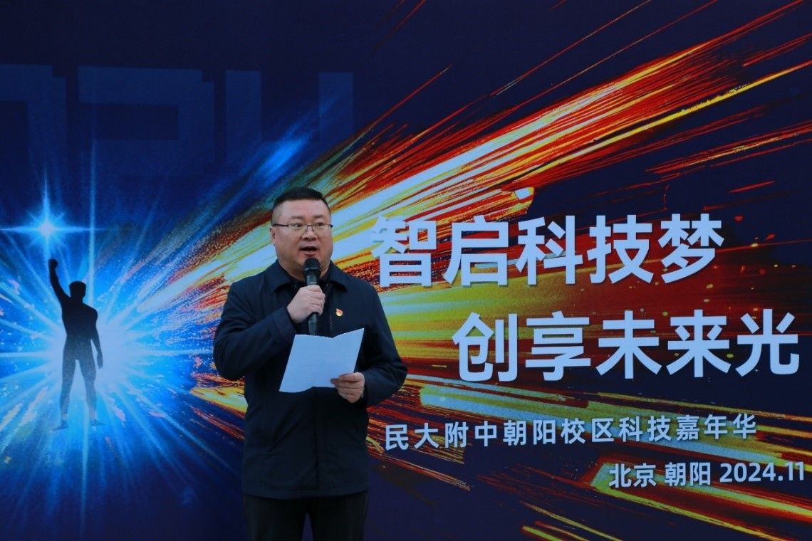 魏立功副校长在开幕式上致辞,他首先代表民大附中校长唐洪波、民大附中党委常务副书记佟丽娟向校区全体师生问好。他强调了科技是国家发展进步的关键,在向科技强国加速迈进的过程中,我国通过不断追赶、努力奋斗取得了丰硕的科技成就,但仍需缩小与国际先进水平的差距。