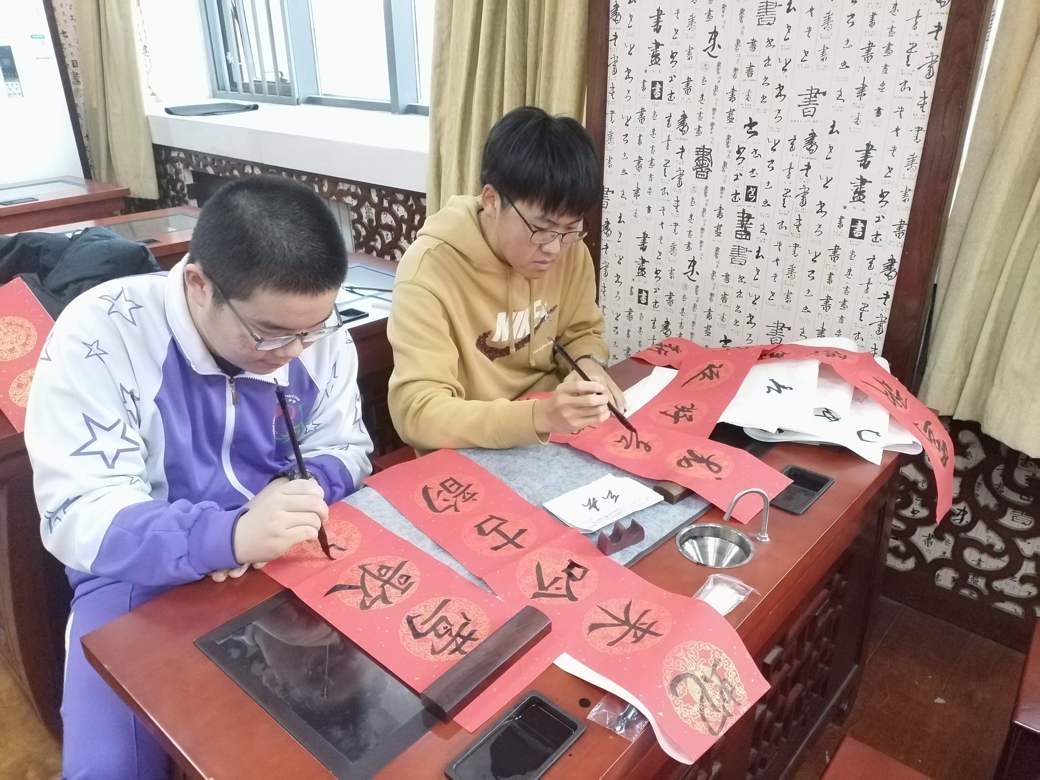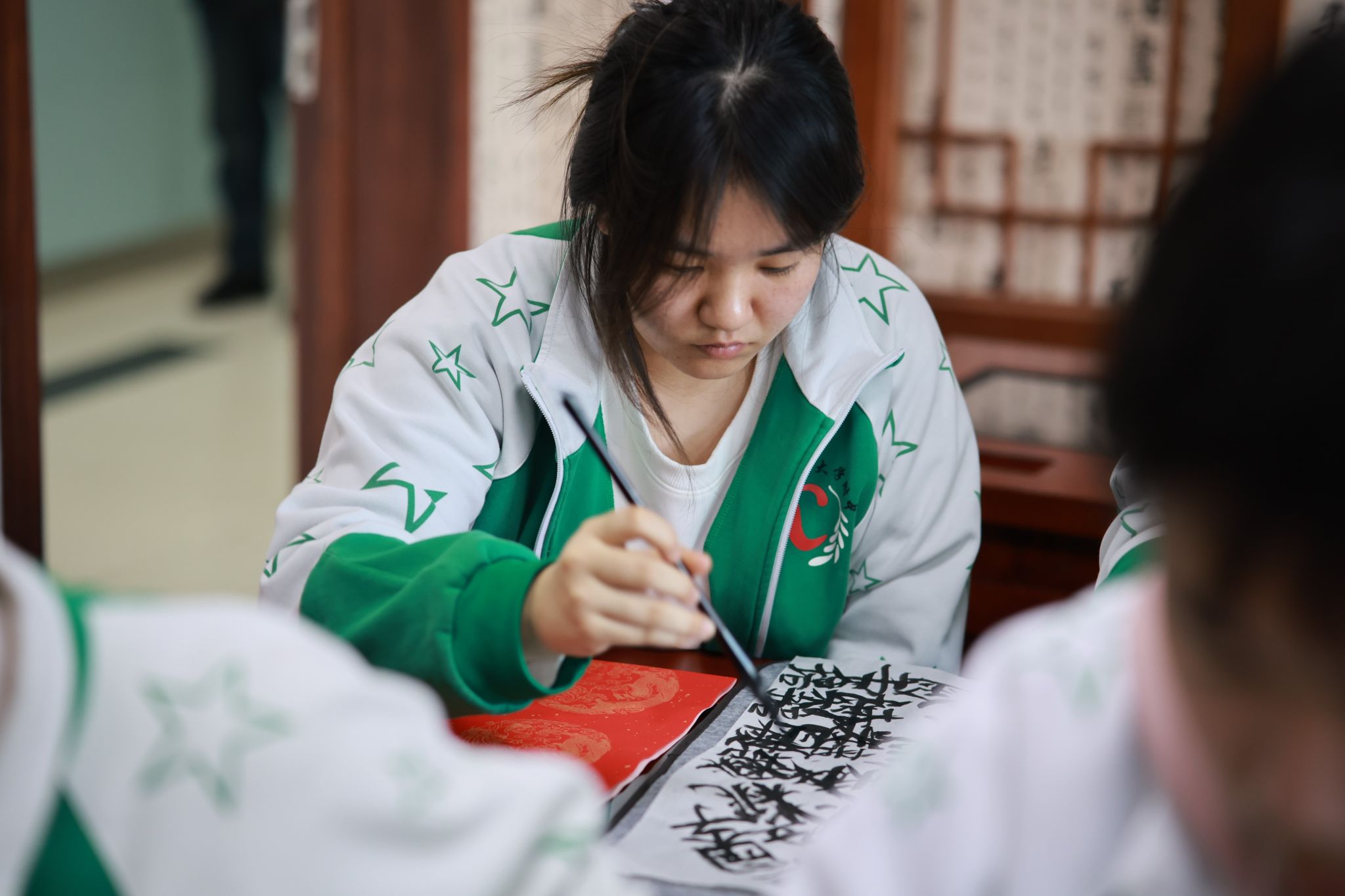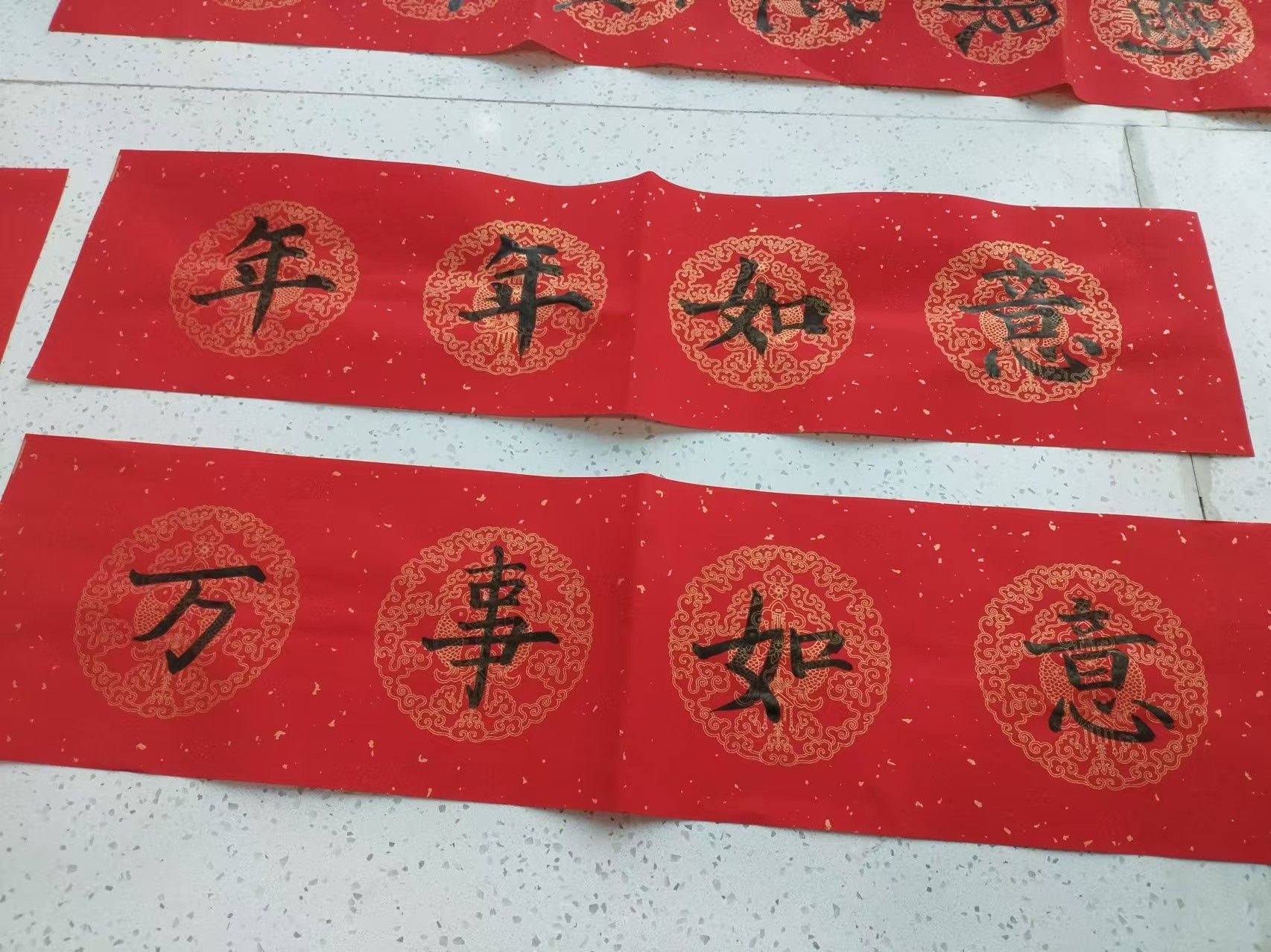 参与活动的同学们和老师现场挥毫泼墨,动作流畅,压纸、蘸墨、挥笔、收笔,笔尖在纸上舞动,他们或临摹或创作,书写着对新年的美好祝愿和对未来的无限憧憬。不一会儿,一幅幅洋溢着节日气息、寓意美好的春联便呈现眼前,每一副春联都充满了个性和创意,汉字和书法的魅力在一笔一画中绽放。