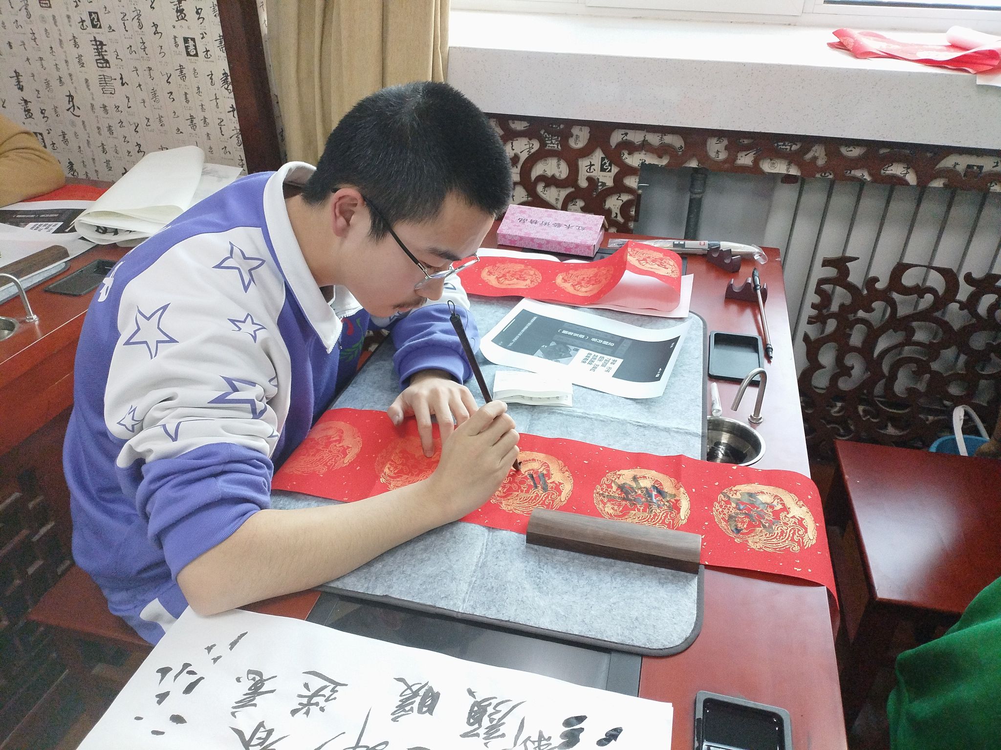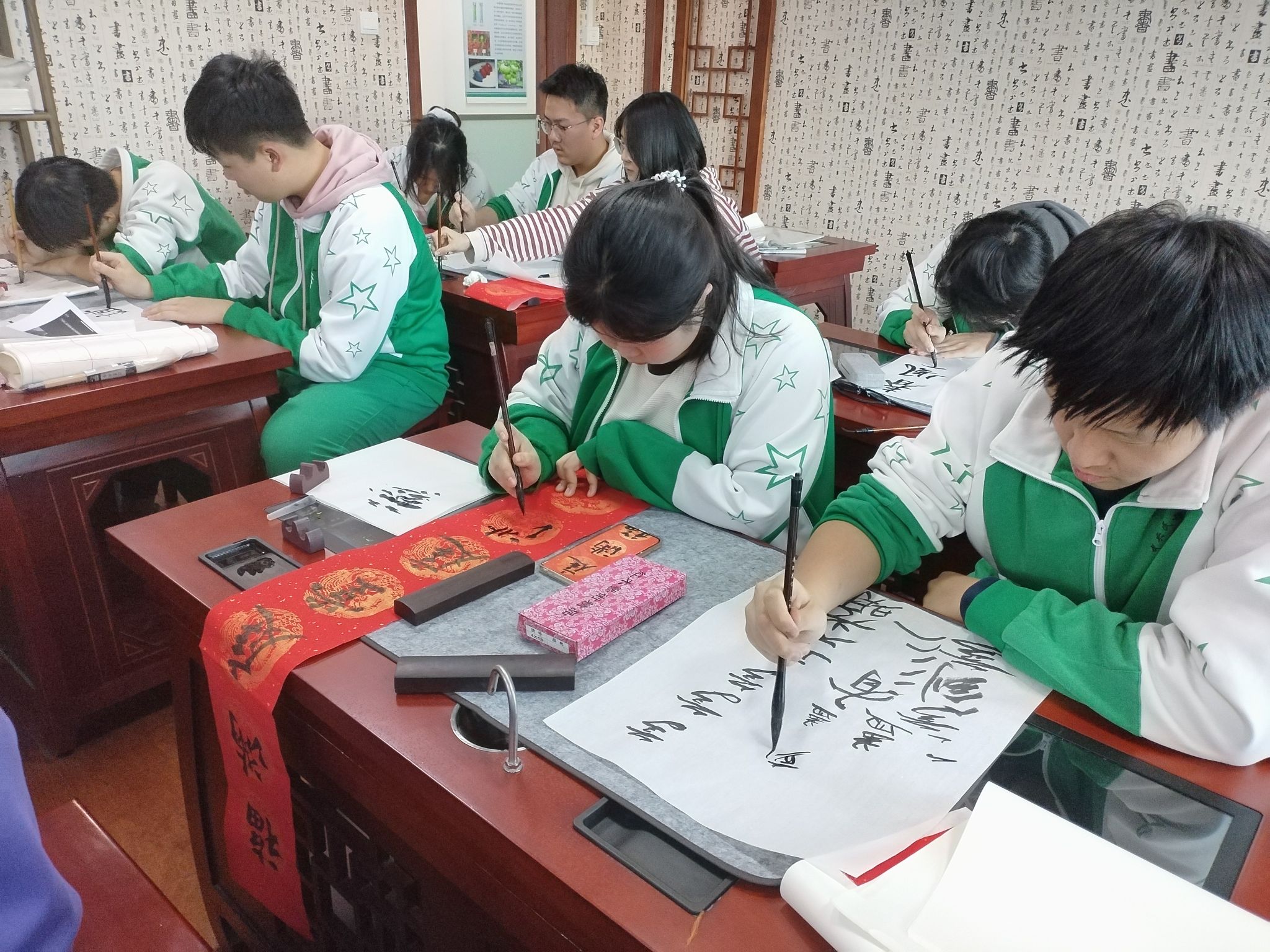 活动在校区书法教室举行,春联纸、毛笔和砚台摆放在桌面上,墨香四溢,井然有序,弥漫着浓浓的书卷气息,令人心旷神怡。