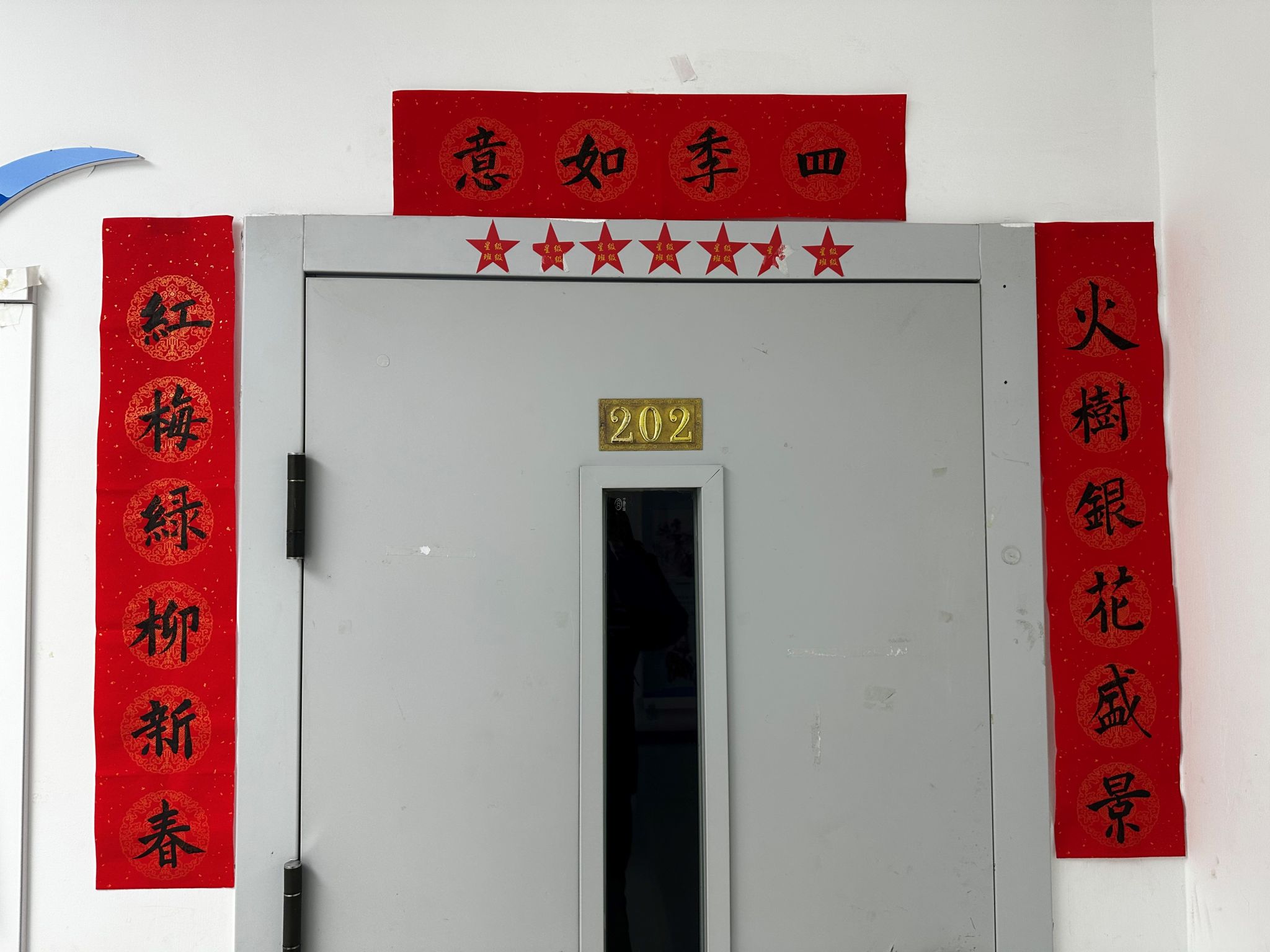 由同学们亲笔书写的春联点缀于各班级,那一抹抹鲜红而充满韵味的纸张,不仅让校园洋溢着温馨与祥和,更表达了对全校师生新年的美好祝福。这些春联如同文化的种子,在校园的沃土中生根发芽,对传统文化的热爱与传承在同学们的心田中茁壮成长。