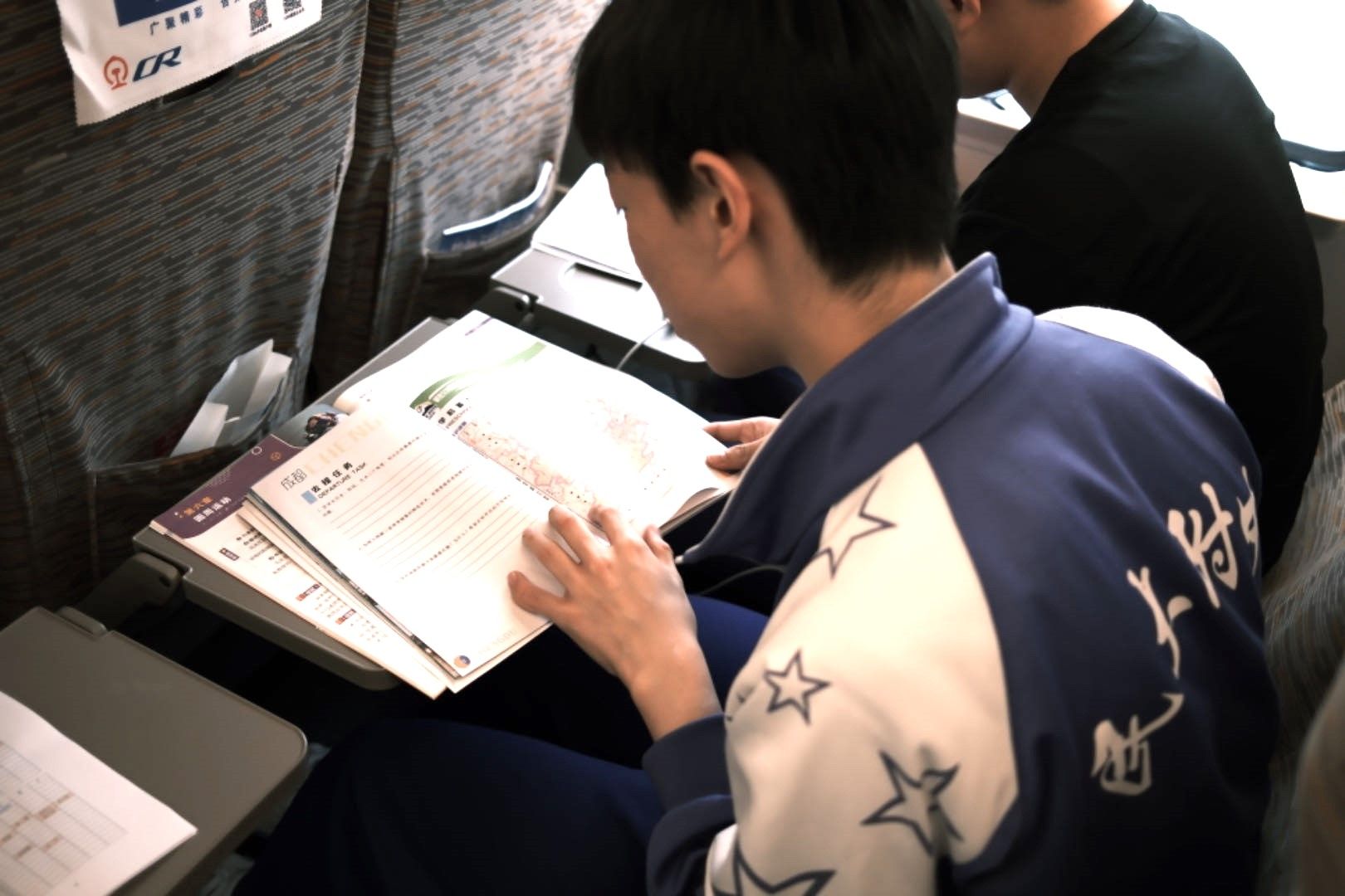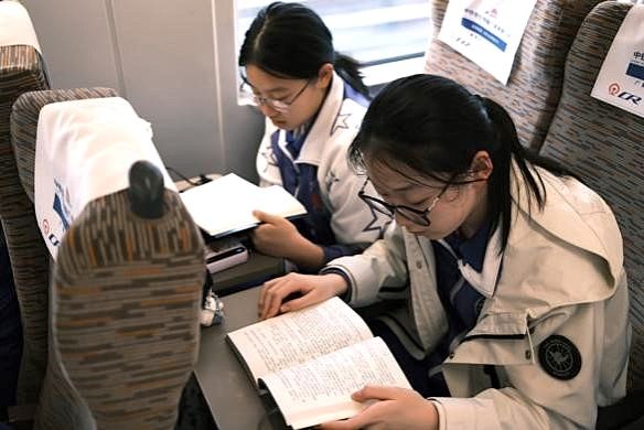 “移动课堂”诠释知行合一。列车以350km/h疾驰时,《中国高铁技术发展图鉴》的书页正在同学们膝头翻动,物理深度爱好者将车头曲线与书中"风阻系数优化"对照验证。