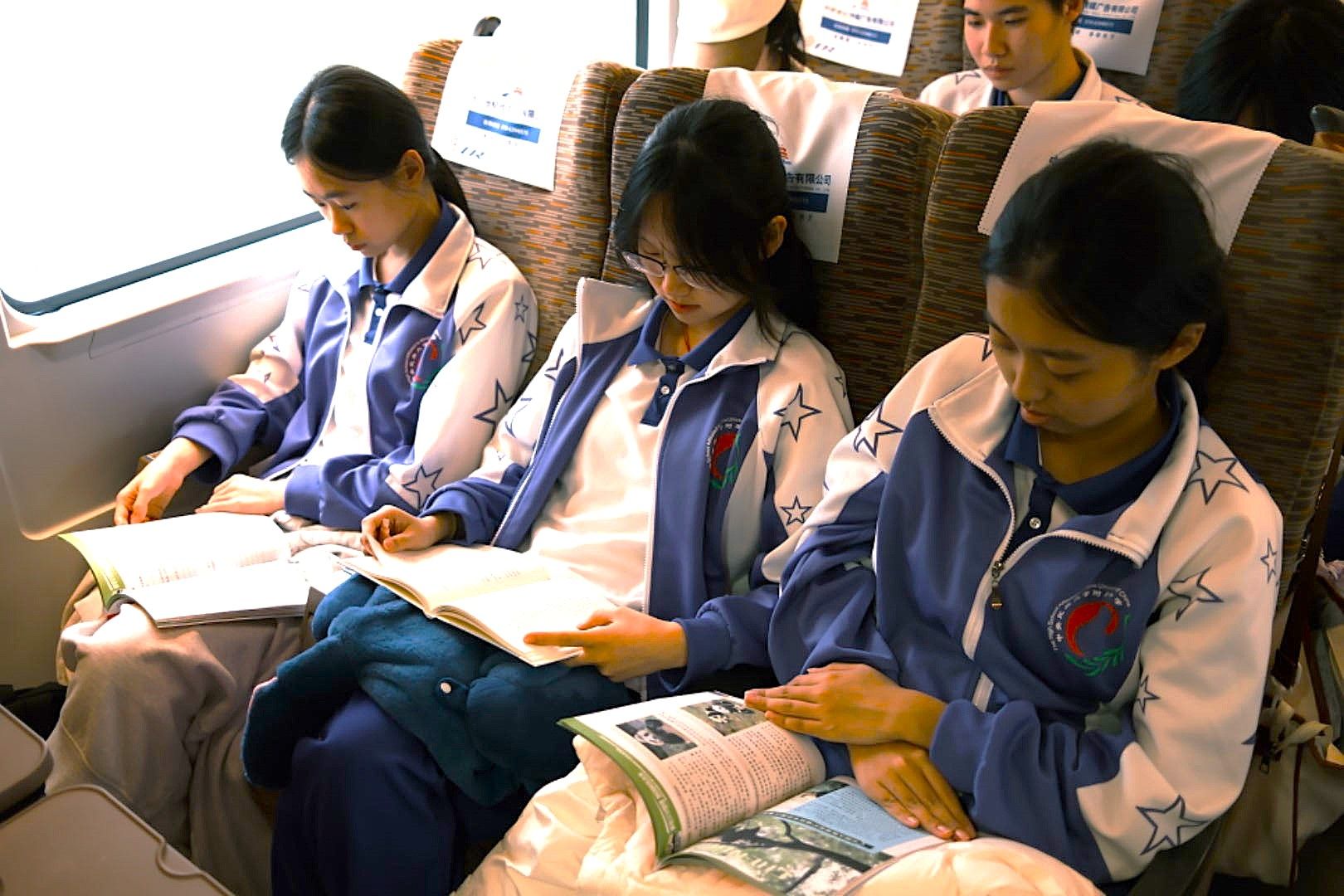 4月21日早晨,民大附中朝阳校区高一年级300余名学子背着行囊、怀揣书卷踏上成都研学的列车。在历时五日的行走中,候车室、高铁上、公园休息的片刻,都有同学们读书的身影。