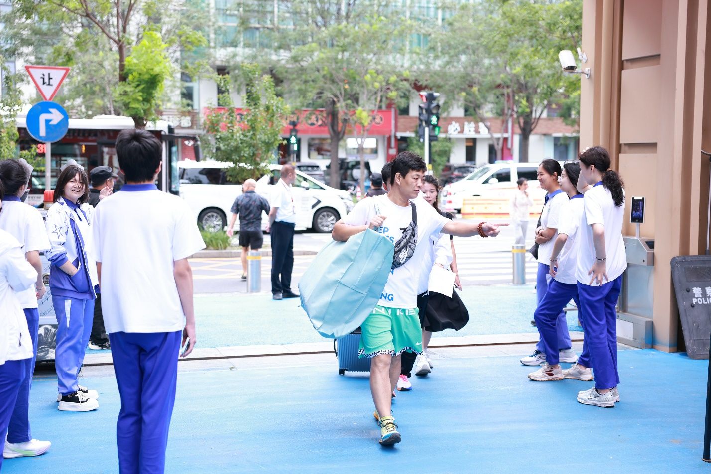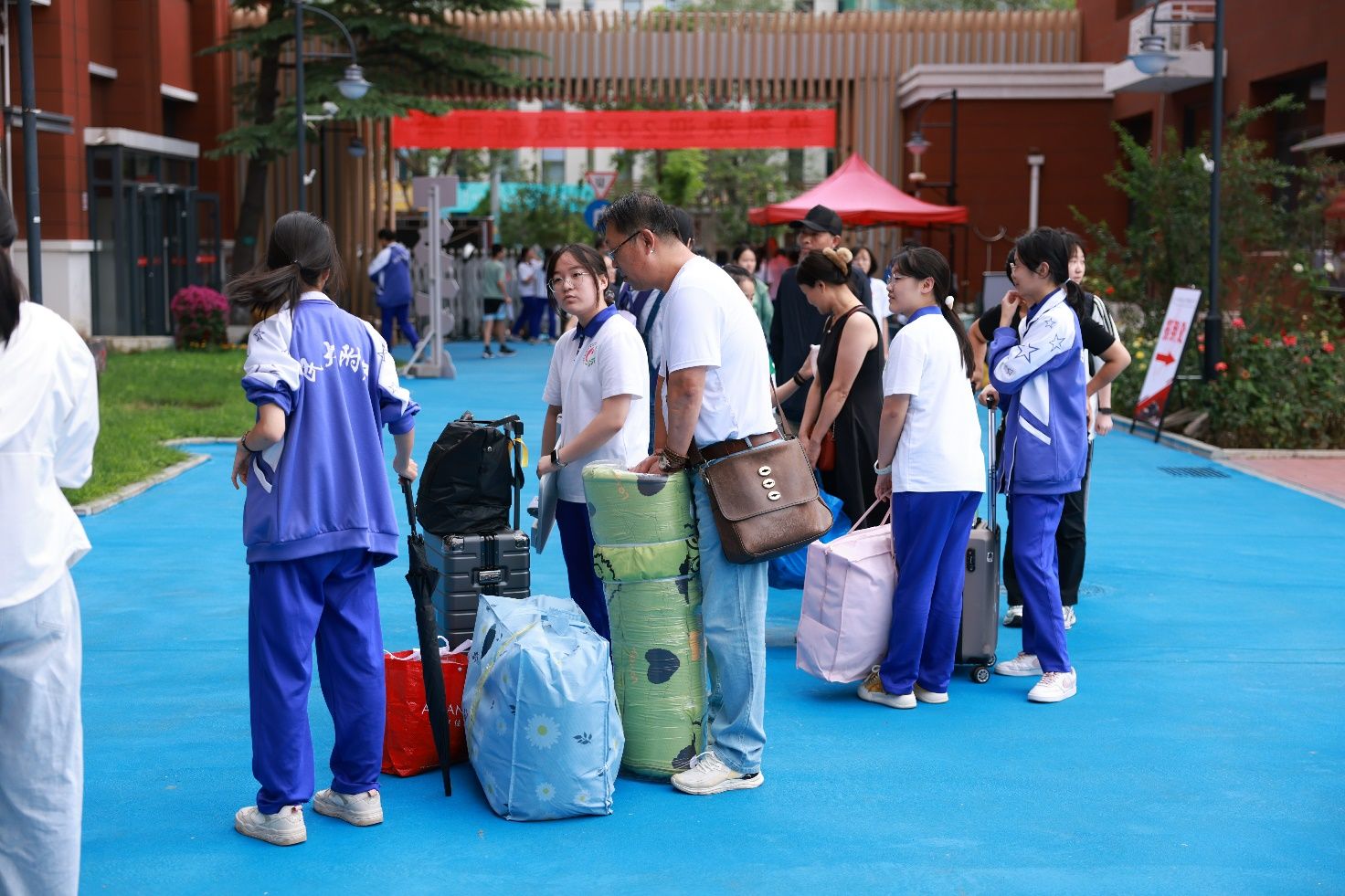 校园内,随处可见紫校服的高二学长志愿者的身影,引导新生办理入学手续、熟悉校园环境,朝阳校区一直以来的"老生带新生"模式传递着温暖的氛围。
