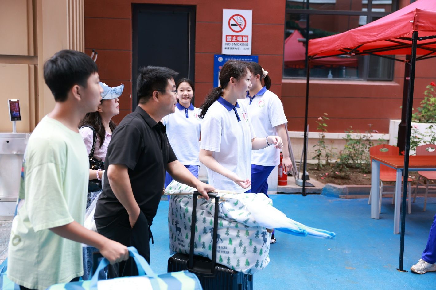 新同学们也彼此交谈着,熟悉着。家长与新生共同整理宿舍、铺设床铺,沉甸甸的行李承载的不仅是生活用品,更是家庭的殷切期望。很多学生和家长也都欣然在学校用餐,品尝着食堂精心准备的美食。