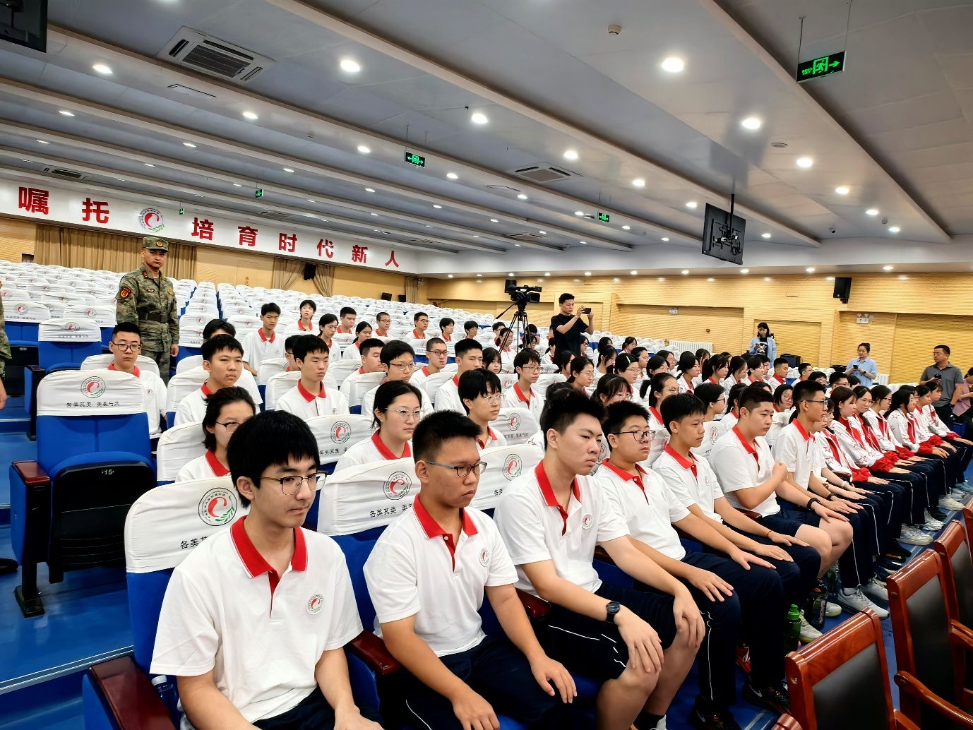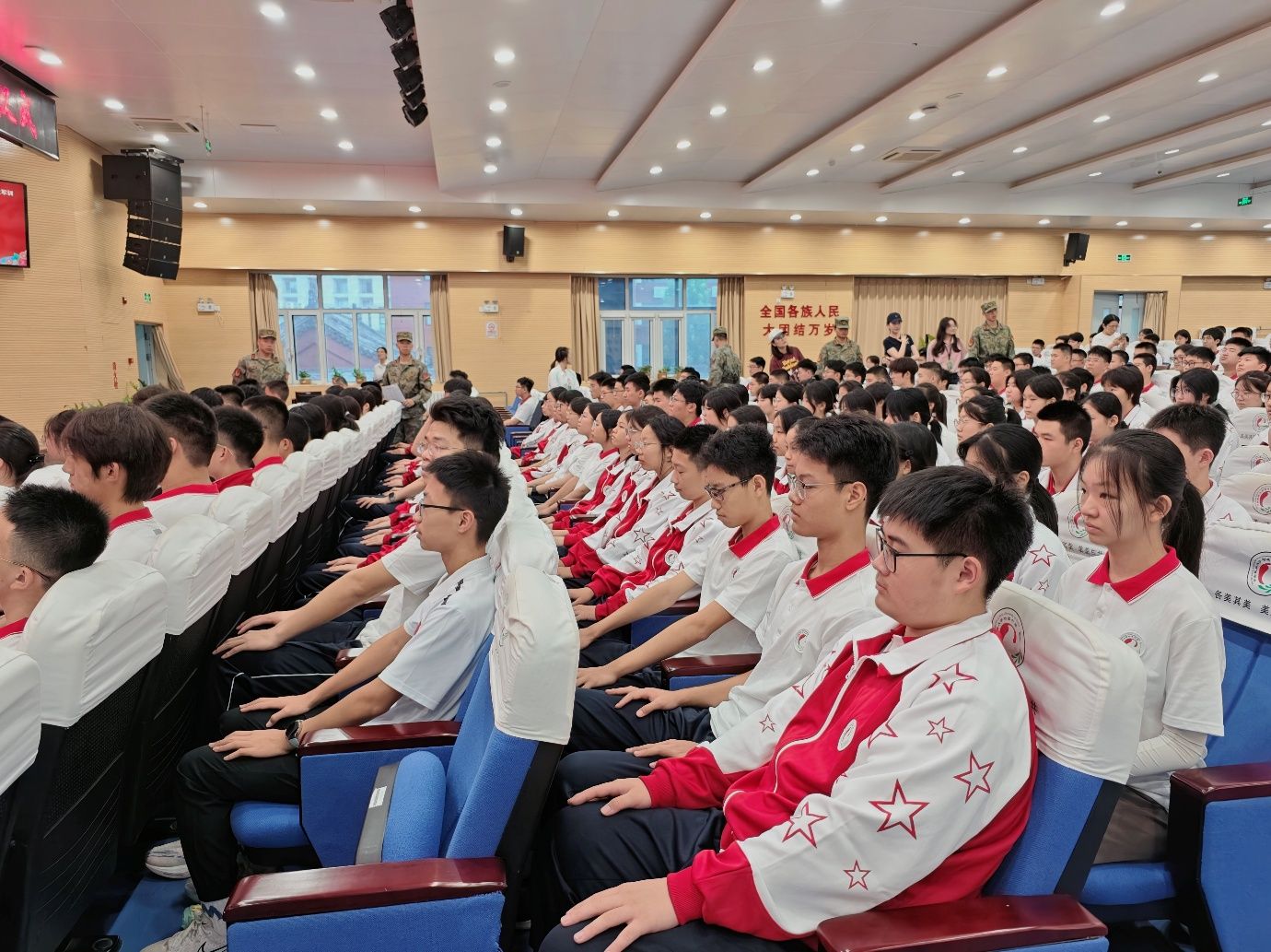 当屏幕上展示出福建舰 36 面雷达的先进配置、东风 - 17 “钱学森弹道” 的不可拦截特性,当韩义大校提及 “我国制造业超过 G7 国家总和”、“歼 - 10CE 战斗机在印巴冲突中 6:0 的战绩” 时,礼堂内多次响起热烈的掌声;而当讲到近代中国遭遇的主权侵犯、如今国际局势的复杂挑战时,学子们则神情凝重。“原来我们的航母舰队这么强,原来‘国防’不是遥远的词,而是和我们每个人的安全感息息相关。”这场讲座不仅填补了学子们的国防知识空白,更让上午开营仪式中 “传承红色基因” 的号召有了更具体的认知支撑,为接下来的训练注入了思想动力。