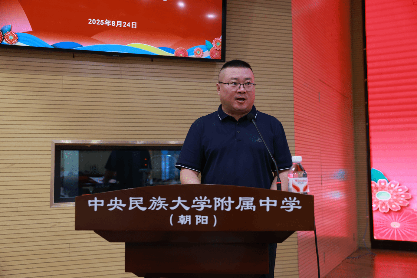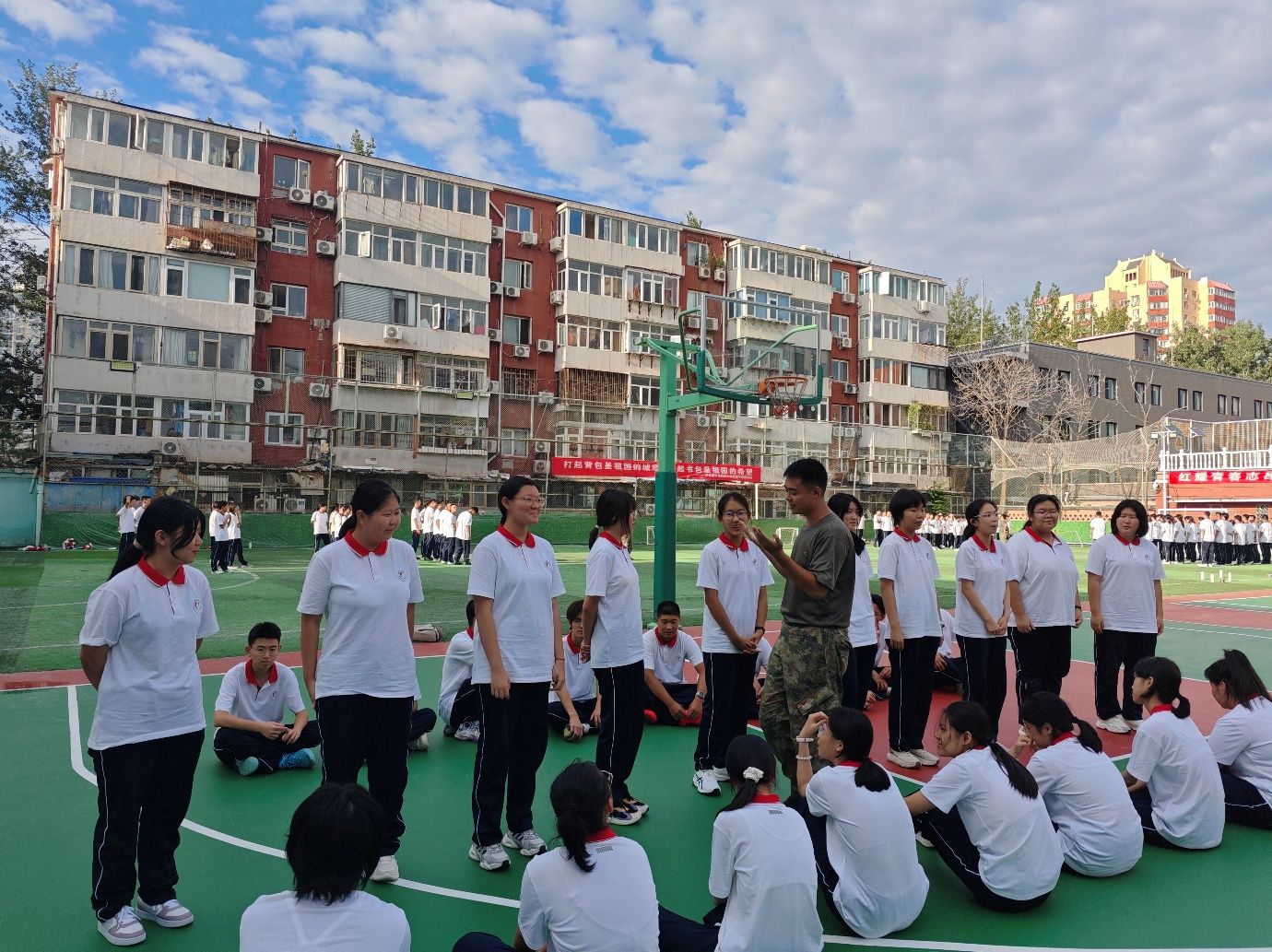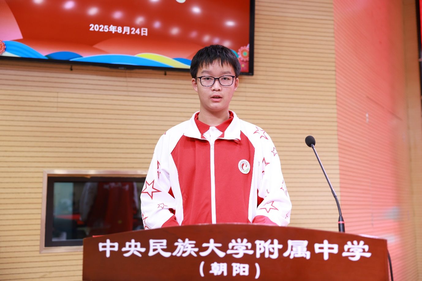 朝阳校区执行校长魏立功发表了鼓舞人心的致辞。他向新同学表示热烈欢迎,向承训部队领导和教官表达诚挚感谢。他提到,2025 年意义重大,在首都北京我们即将迎来抗战胜利 80 周年纪念活动。回顾历史,中国人民历经艰苦斗争取得胜利,各民族团结一心。如今,在中国共产党领导下,国家日益强大。民大附中作为百年老校,有着光荣办学史,新同学的加入为学校注入活力。他强调了军训的重要性:有助于增强同学们的国防意识,培养严明纪律和良好习惯。他希望同学们加强组织纪律性,听从指挥,刻苦训练;也希望参与军训的干部教师扎实做好工作,关心爱护学生。