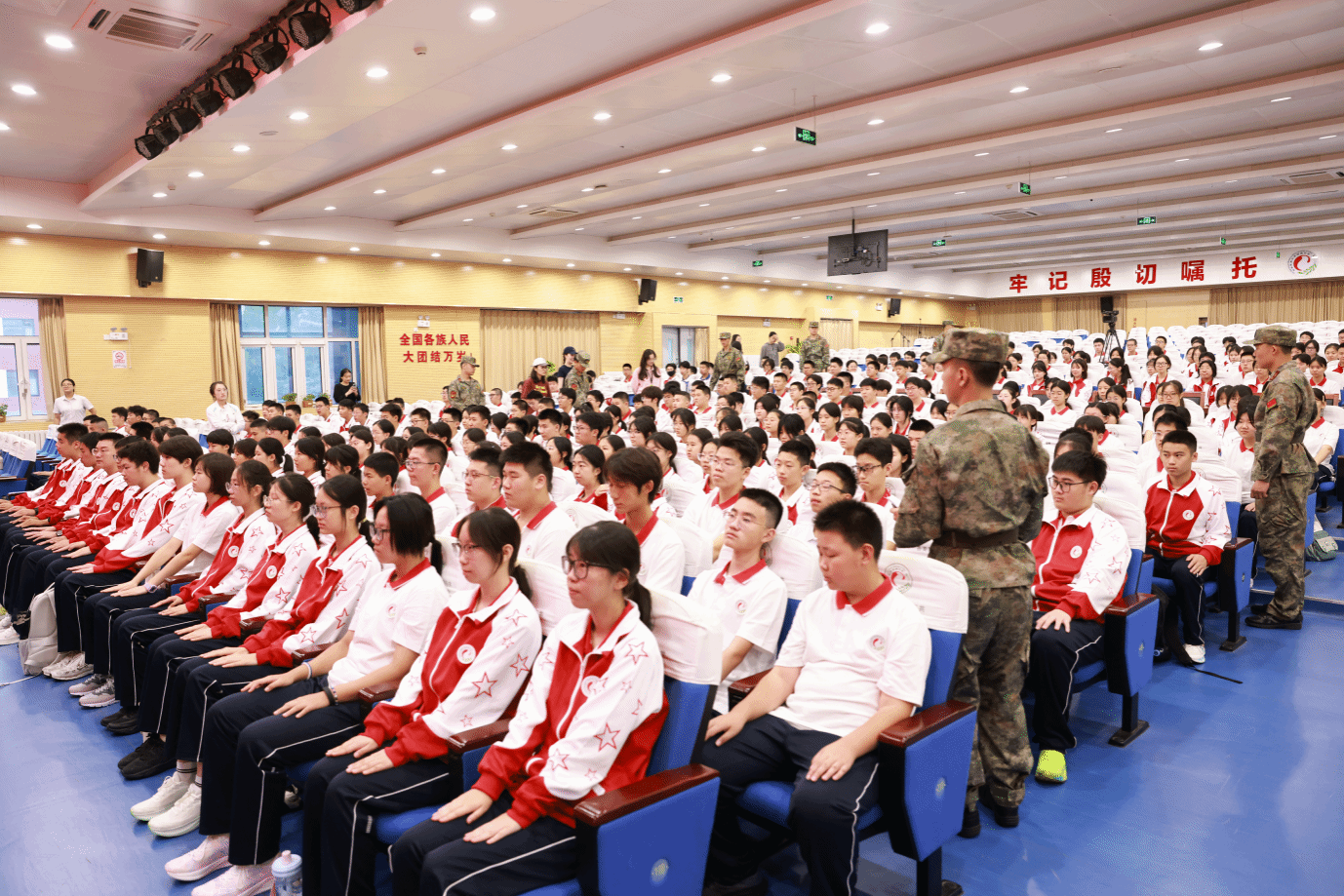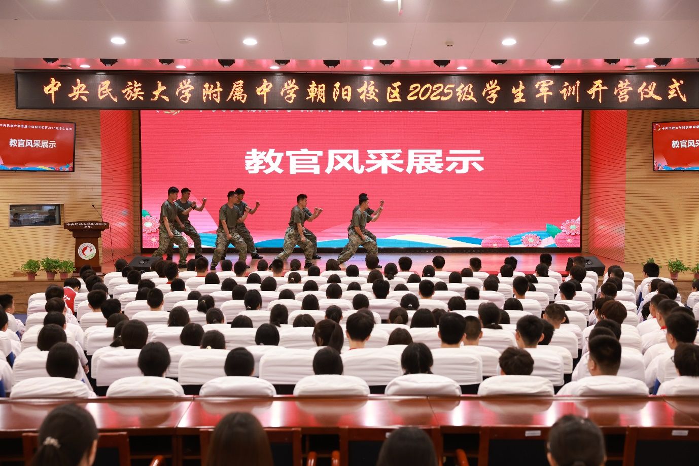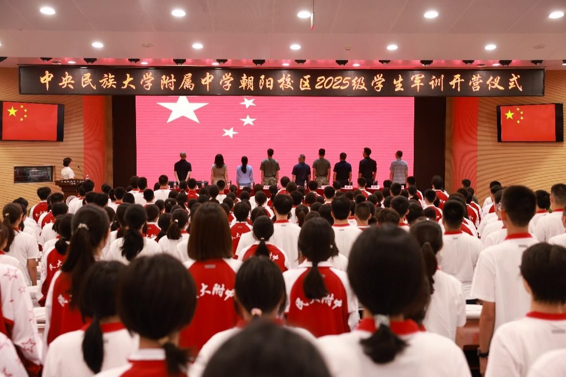 随着朝阳校区执行校长魏立功庄严宣布 “民大附中朝阳校区2025级学生军事训练开营仪式现在开始”,全场响起热烈掌声。仪式第一项即开启爱国主义教育的序章:升国旗、奏唱国歌,主席台全体人员肃立,在场师生齐声高歌,赤诚的爱国情怀在礼堂内久久回荡;随后升校旗、奏唱校歌,民大附中的精神融入歌声,为学子们的军训征程注入归属感与使命感。