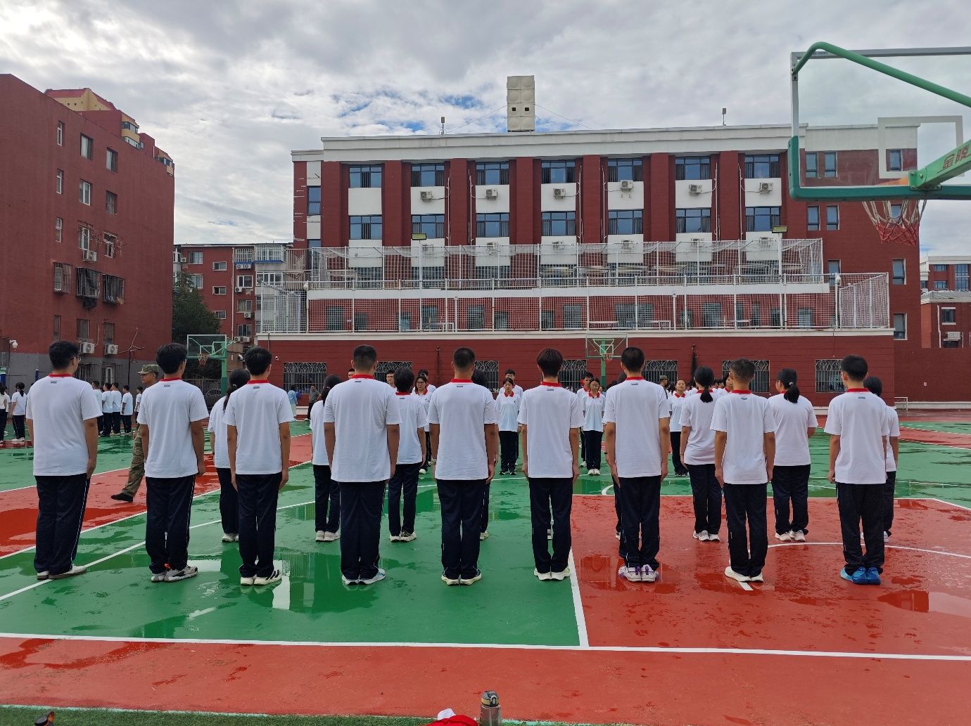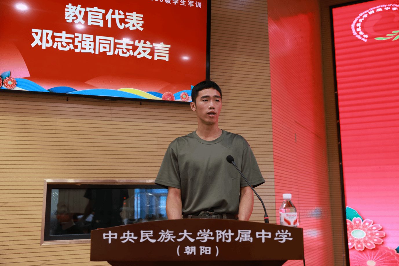 教官代表、中国人民武装警察部队第二机动总队邓志强同志的发言,则巧妙串联起民大附中的红色校史与军训的精神传承。“1913 年,民大附中前身国立蒙藏学校创立,这里诞生了中国共青团、中国共产党首个少数民族团支部和党支部,走出了乌兰夫等爱国志士,团结同心的红色基因,早已刻进民附的血脉里。” 他强调,军训是传承精神新起点 —— 虽非专门爱国课,但烈日站军姿、训练练配合,正是续写民附人品格,如前辈般以坚持扛挑战、以协作聚力量。他还向学子提三点要求:一是敢拼敢扛,学前辈拼搏劲过难关;二是学会协作、融入集体,守 “各民族同心”;三是沉淀收获,将训练场上的严谨、同学间的互助化为今后力量。