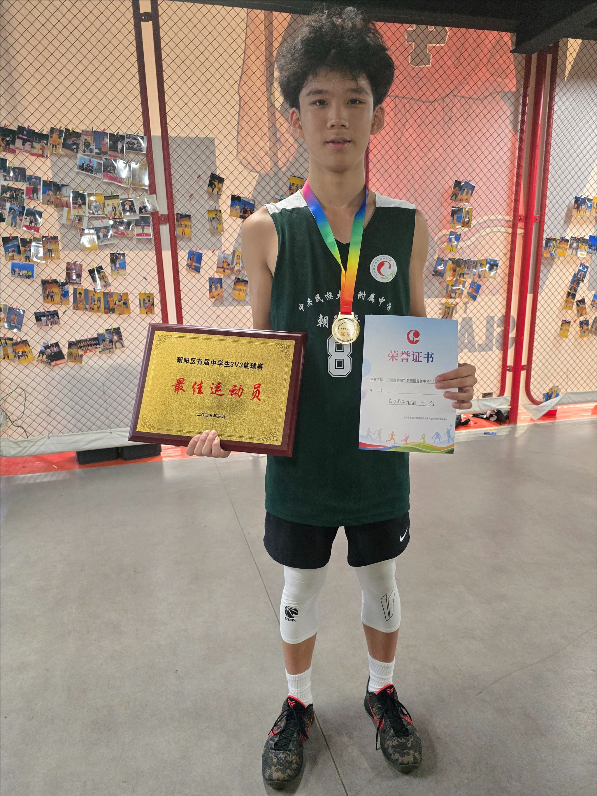 2025年7月8日,民大附中朝阳校区男篮首次参加朝阳区教委、朝阳区体育局共同举办的届朝阳区中学生3v3篮球赛,经过一天的激烈角逐,队员们用汗水与拼搏诠释了青春的无限可能,用团结与奋斗书写了属于他们的荣耀篇章,最终获得高中男子组第一名的佳绩,何佳曈荣获最佳运动员称号。