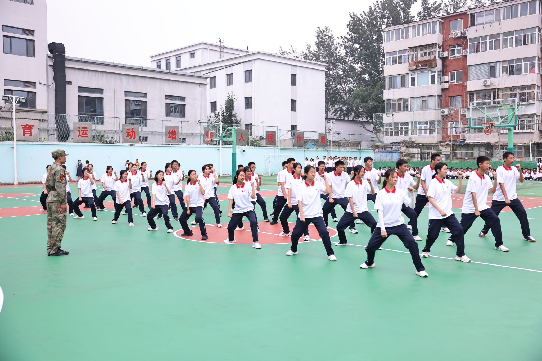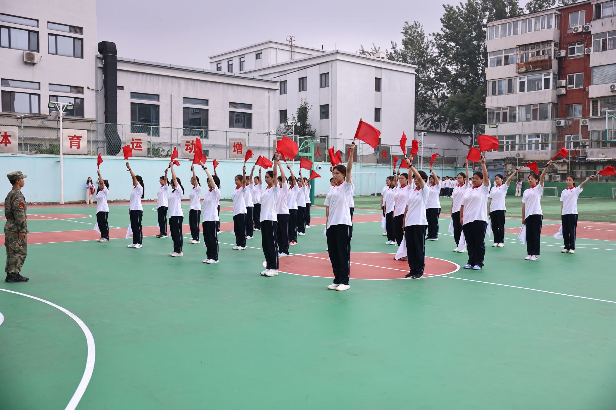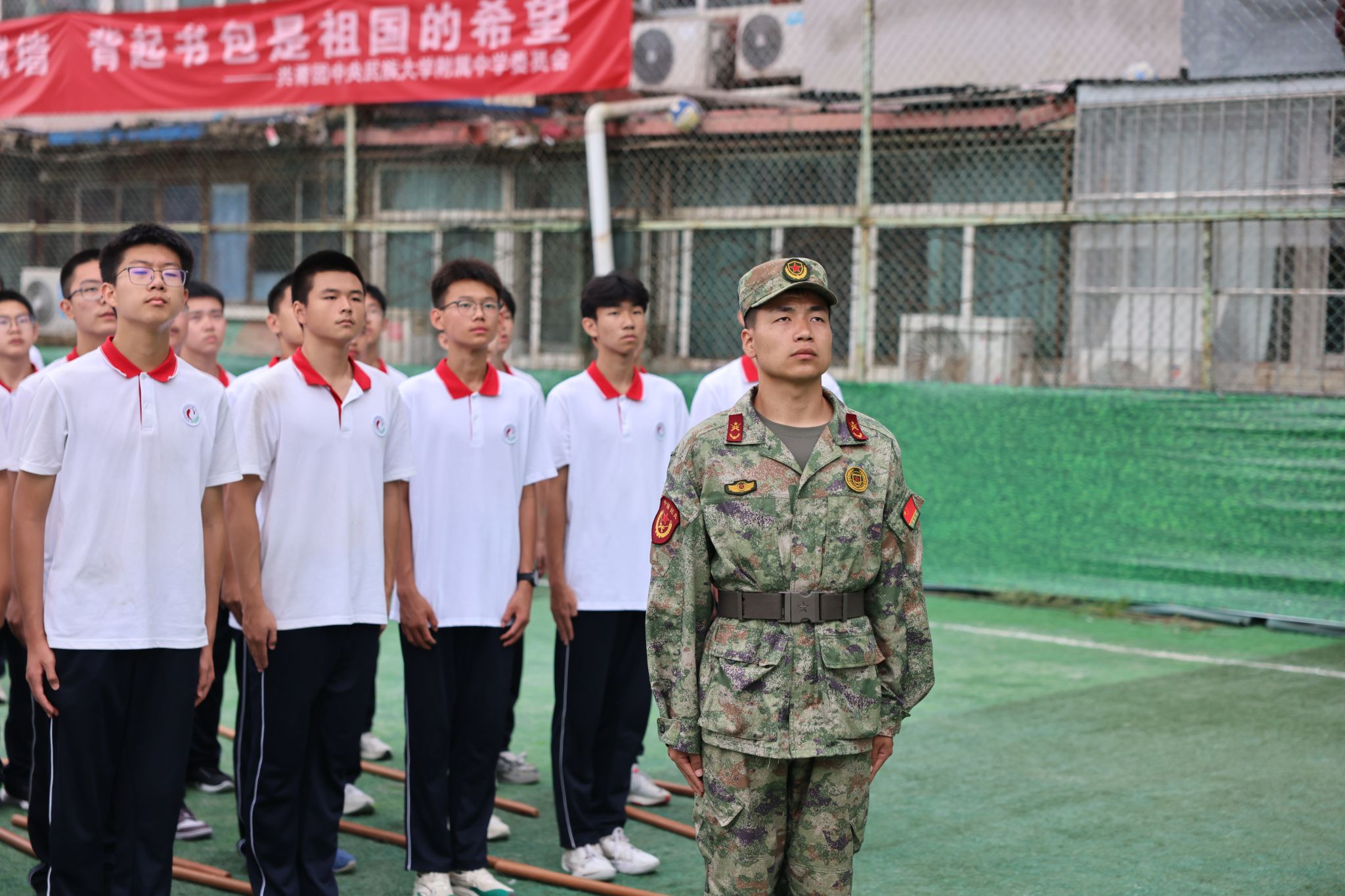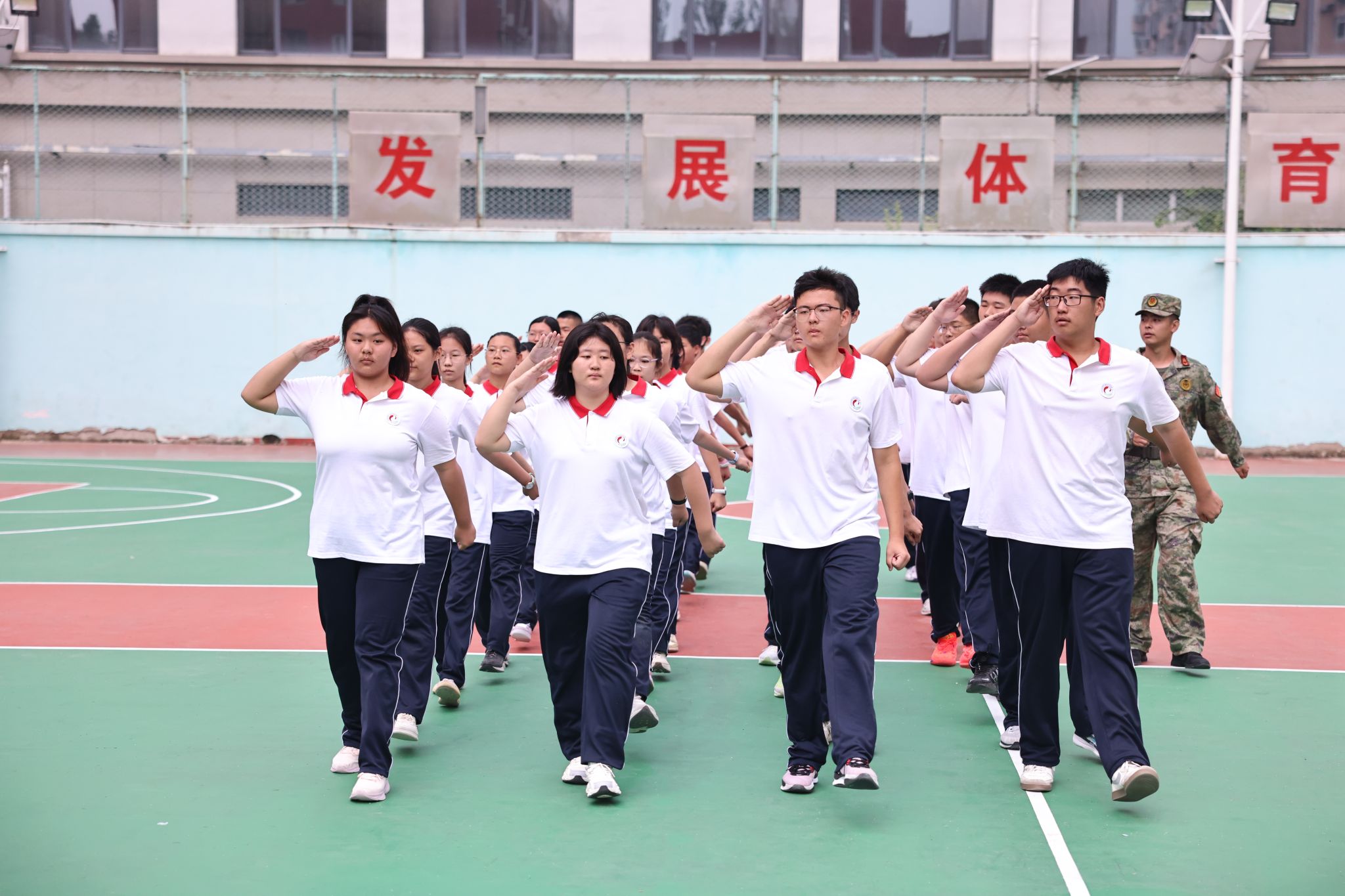 仪式在庄严的升国旗、奏唱国歌中拉开序幕。全体人员肃立,五星红旗冉冉升起,迎风飘扬,在场师生与教官齐声高唱国歌、校歌,爱国情怀与青春朝气在操场上空交融。