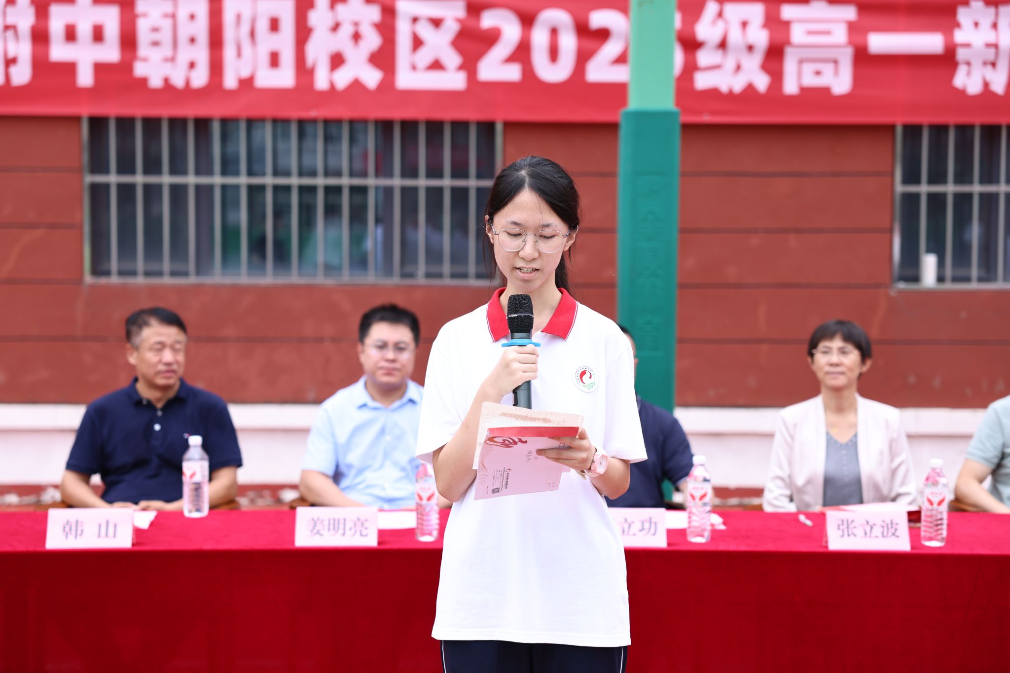高一年级新生代表唐一丹发言:“军训教会我们的不只是站军姿、走队列,更是面对困难时的坚韧和与同学并肩时的团结。”新生们会把军训中锤炼的“不怕苦、不服输”精神带到未来的学习生活中,以自律为笔、以奋斗为墨,书写高中生涯的新篇章。