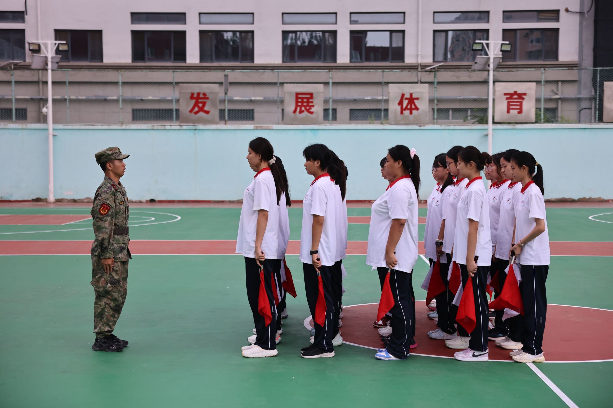 接下来,一场别开生面的旗语展示活动燃动全场。由女生组成的旗语方队,以规范的动作、整齐的队列和铿锵的气势,将无声的旗帜化作“语言”,成为军训场上一道独特的风景线。训练中,她们顶着烈日,反复打磨每一个动作细节。从握旗的力度、挥旗的角度,到转身的节奏、队列的间距,他们在教官的耐心指导下,逐人纠正、逐排过关。