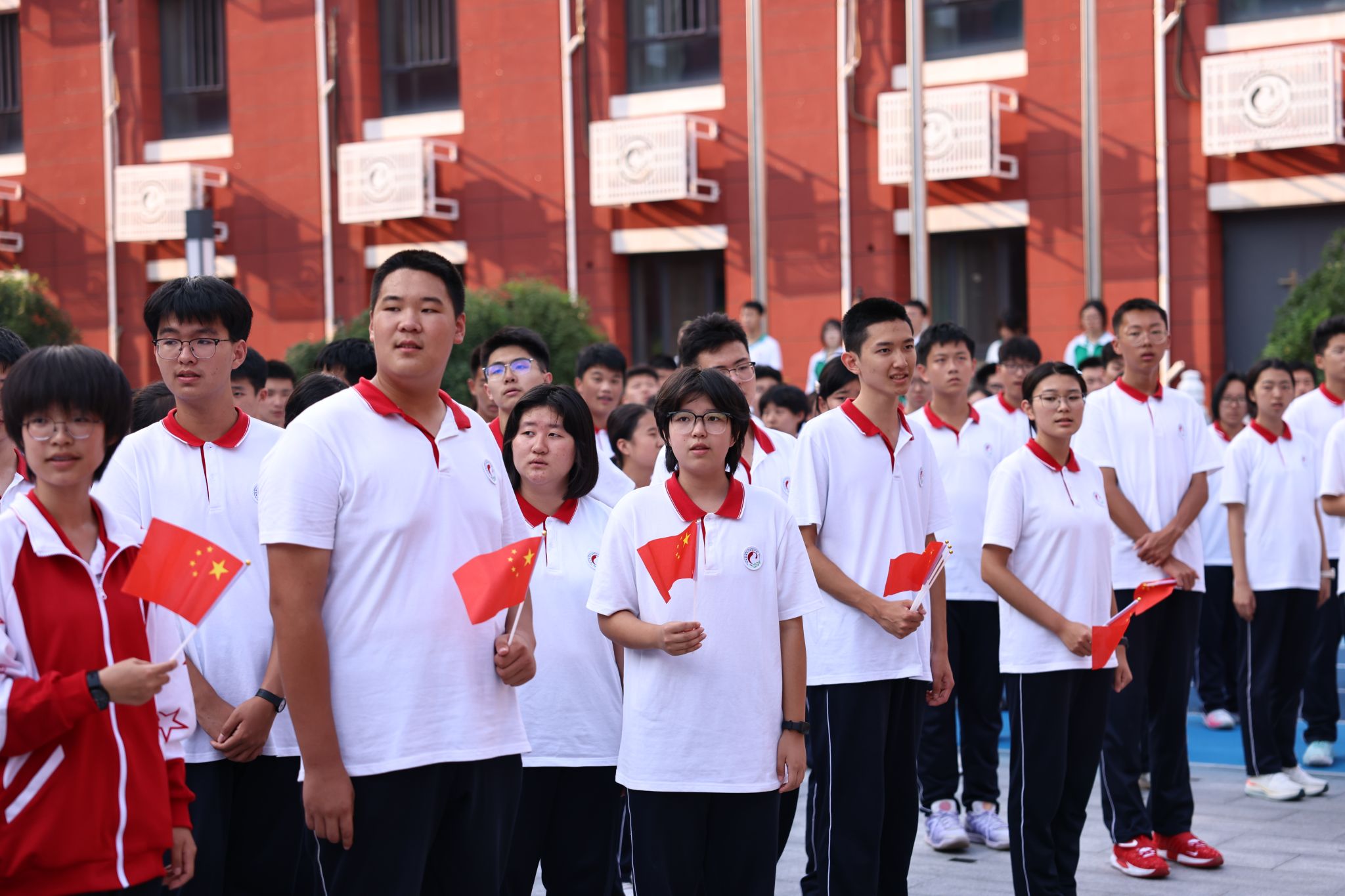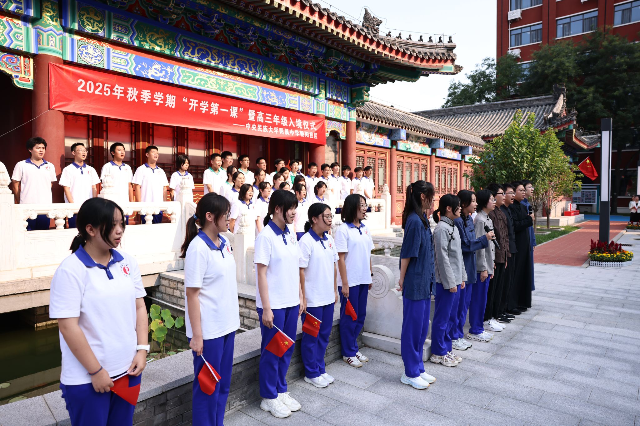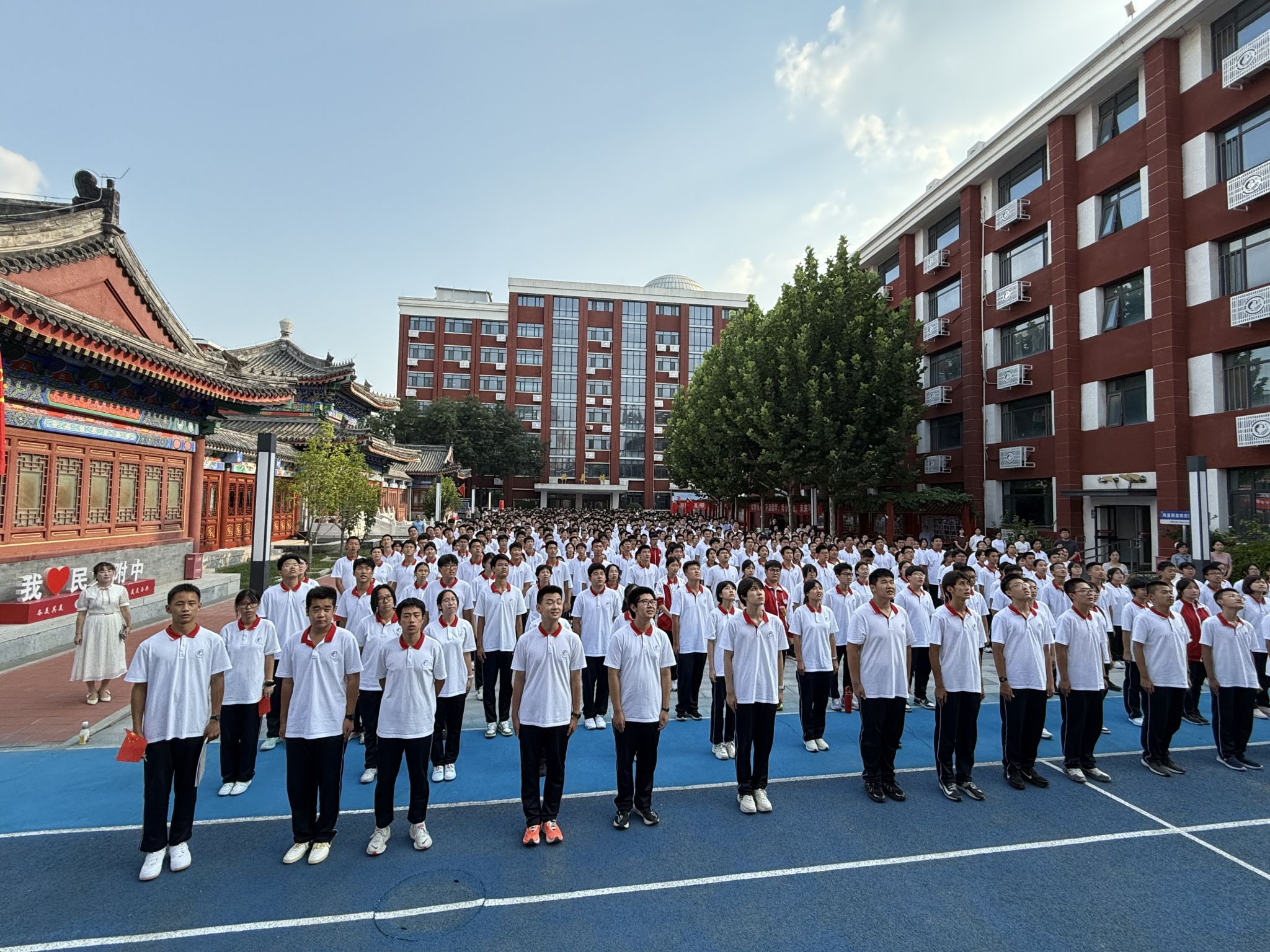 9月4日下午,民大附中朝阳校区辟雍广场上,五星红旗迎风飘扬,激昂的歌声在空中回荡,校区全体师生以庄严仪式传承抗战精神,开启新学期征程。全体师生通过重温历史、致敬先烈、展望未来,将抗战精神融入新学期的学习和生活,为高三学子加油鼓劲。