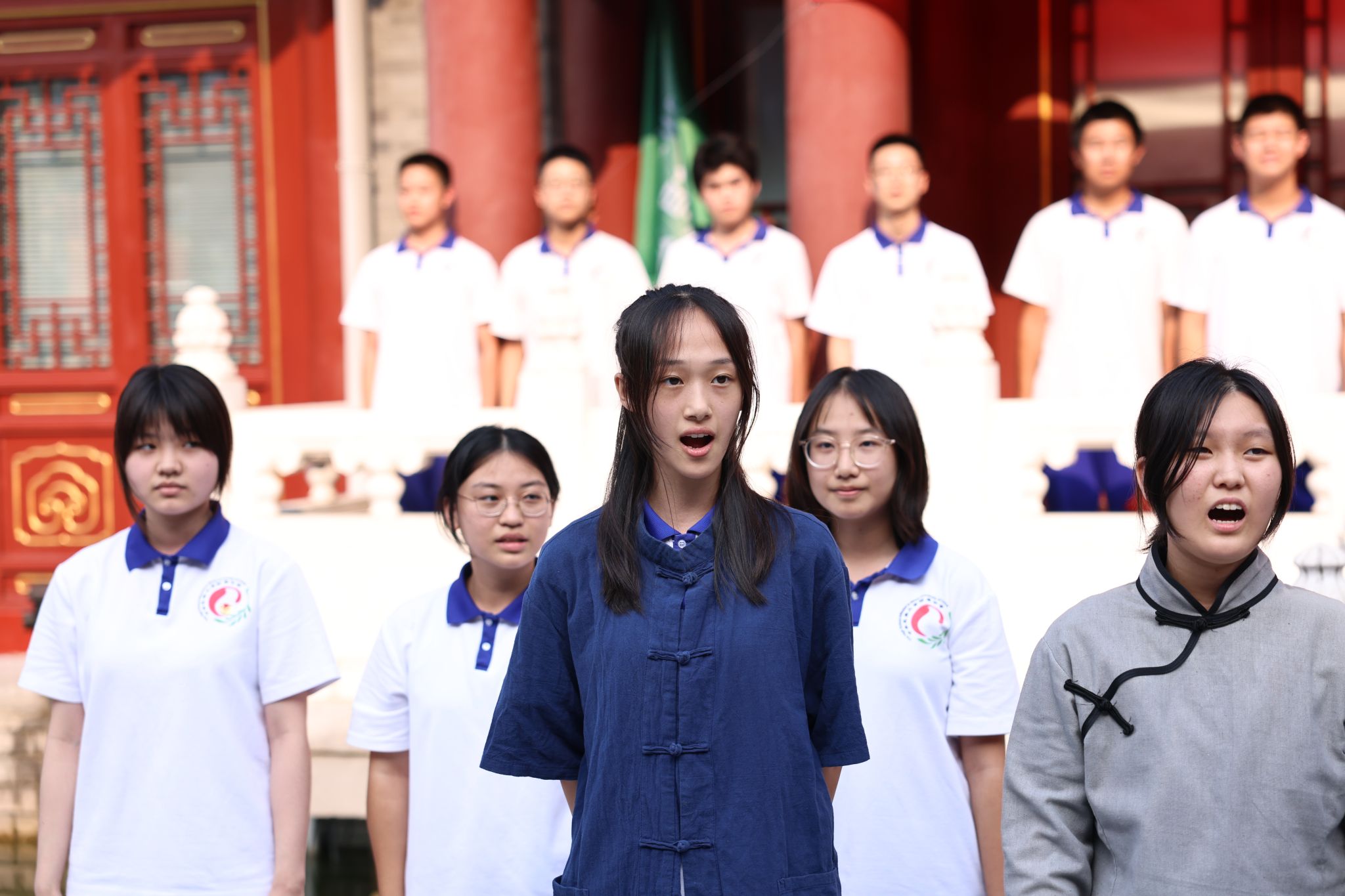 活动在激昂的歌声中正式开始。由高二、高三年级合唱团带来的革命歌曲串烧《太行山上》《保卫黄河》,瞬间将大家带回到那个烽火连天的年代。一曲曲壮歌,唱出了中华民族的不屈与顽强,也让同学们体会到今日幸福生活的来之不易。歌声落下,全场肃立,升国旗、奏唱国歌。紧接着,校旗冉冉升起,歌声回荡在校园的每个角落。