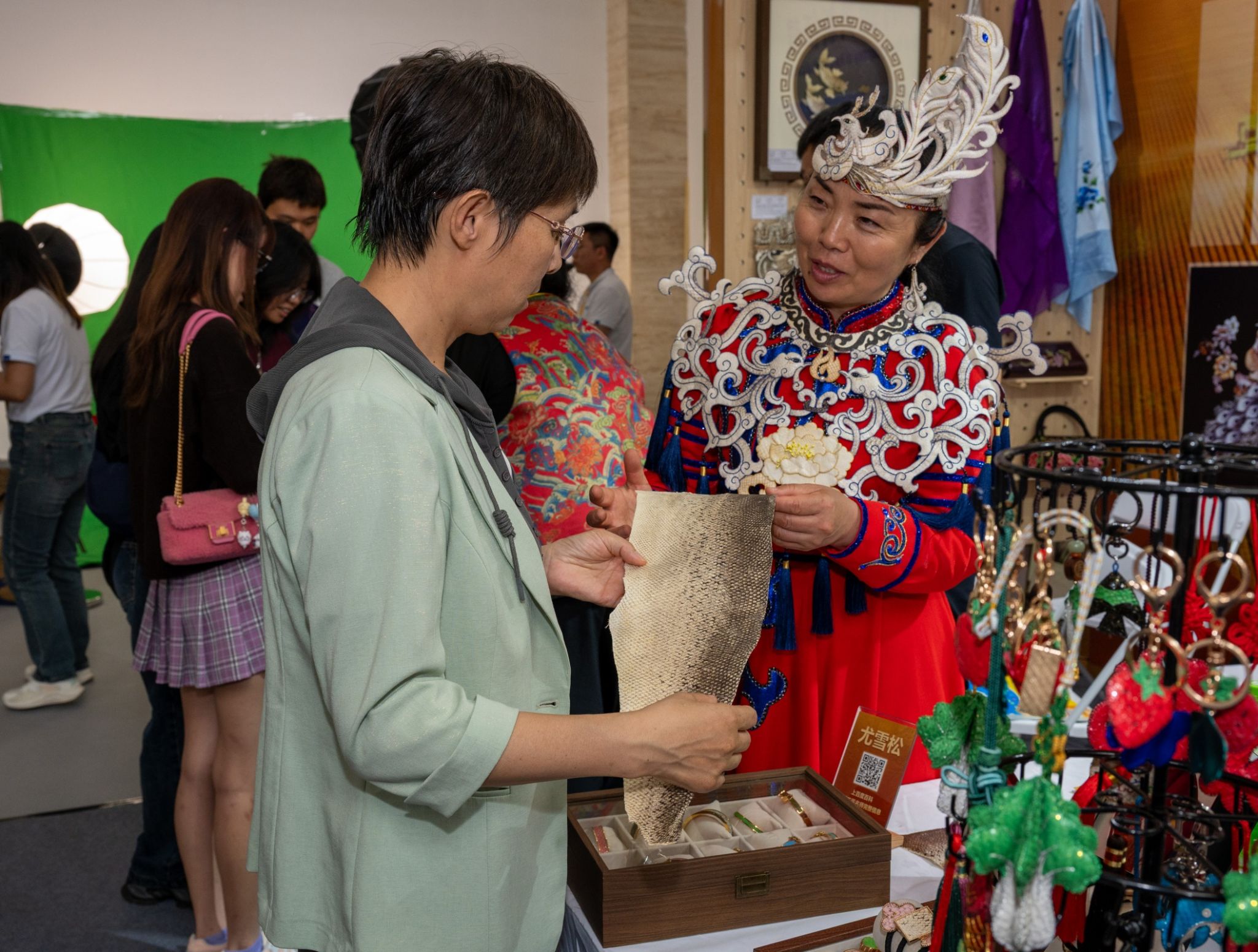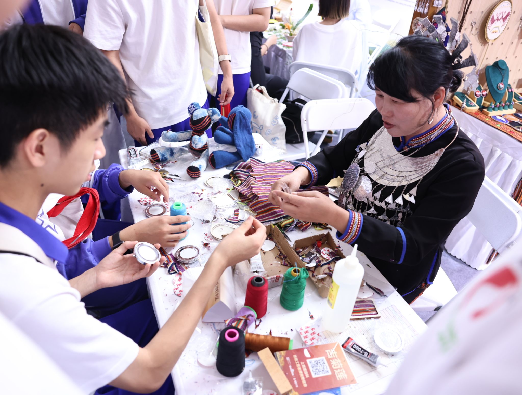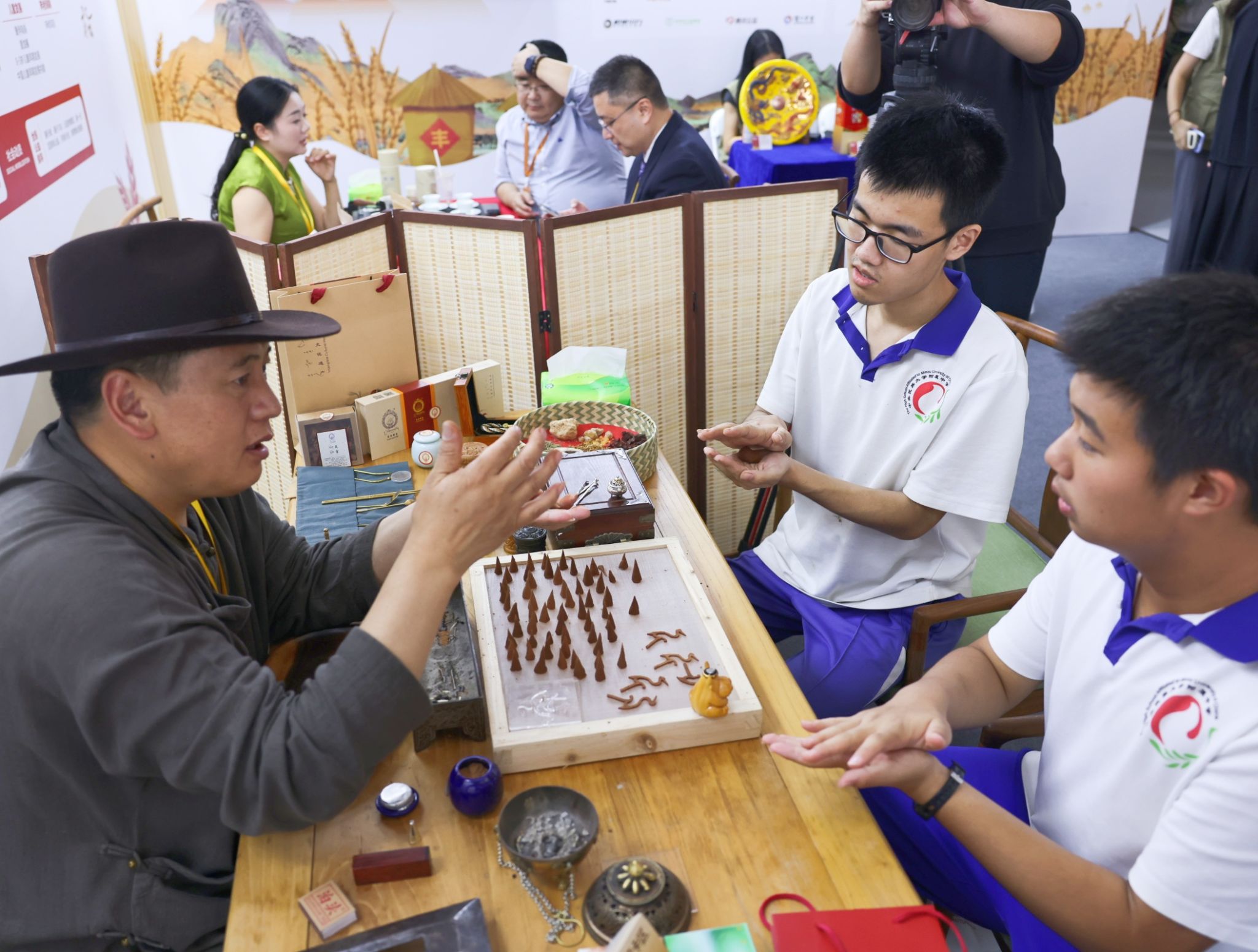 步入展馆,匠心传承主展区即刻吸引了学子们的目光。来自全国各个省、自治区、直辖市的50余名乡村工匠现场献艺,形成一道流动的“非遗风景线”。陕西剪纸传承人指尖翻飞,不到三分钟便剪出一幅“丰收瑞兽图”;浙江木雕师傅手持刻刀,在黄杨木上精雕细琢,牡丹花瓣的层次感渐次显现;云南陶艺工匠则演示着古老的拉坯技艺,转盘旋转间,一团陶土逐渐塑造成温润的茶盏。学子们围拢在展台前,或轻声询问技艺细节,或用手机记录创作瞬间,不时发出“太神奇了”“这得练多少年啊”的由衷赞叹。