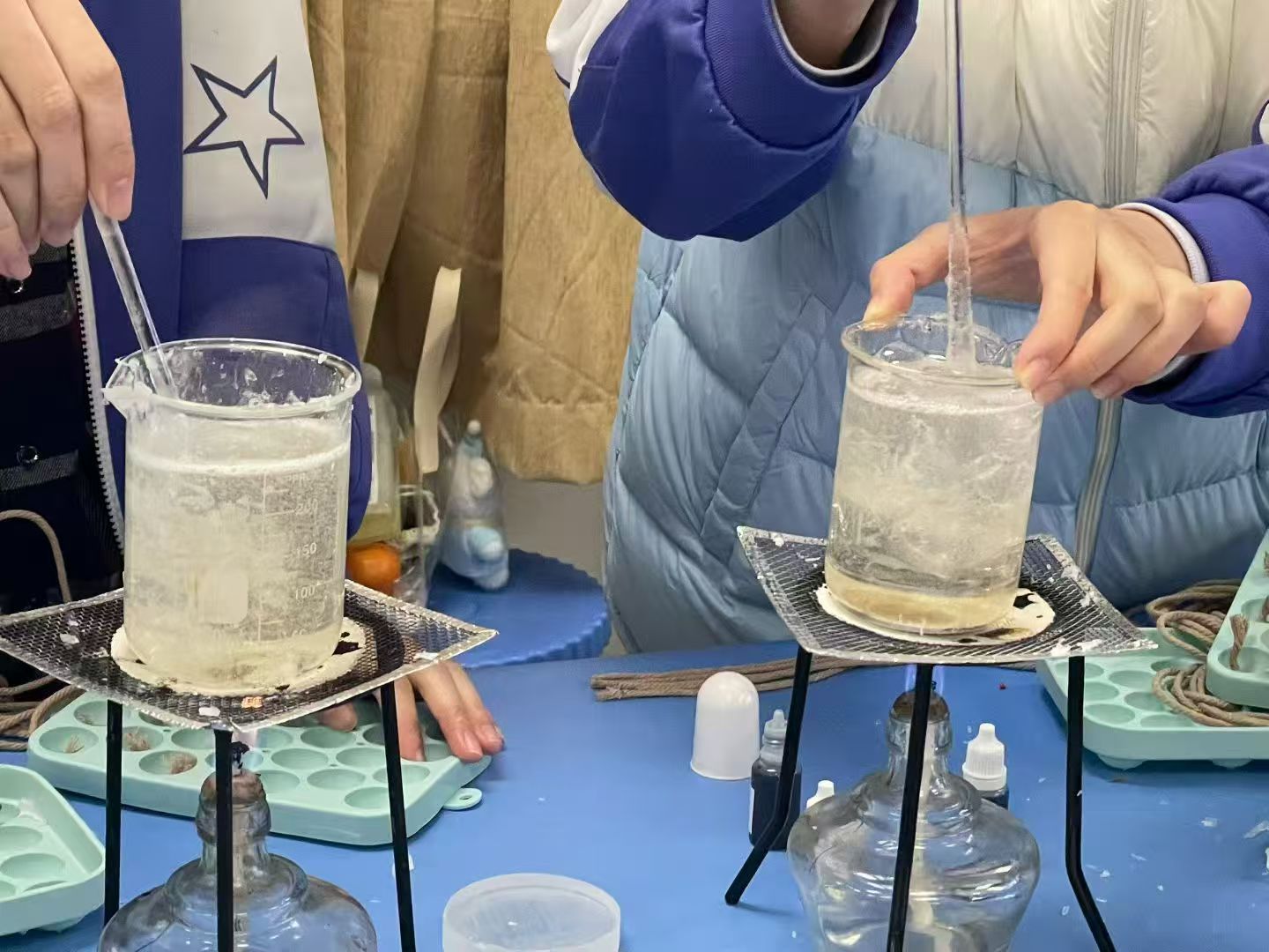 这一站,同学们化身“调香师”与“蜡烛匠人”。将大豆蜡片缓缓加热融化,如同进行一场温柔的熔岩实验。待蜡液冷却至适宜温度,再精心滴入挑选好的香薰精油——是清雅的茉莉,还是宁静的雪松?全凭个人心意。