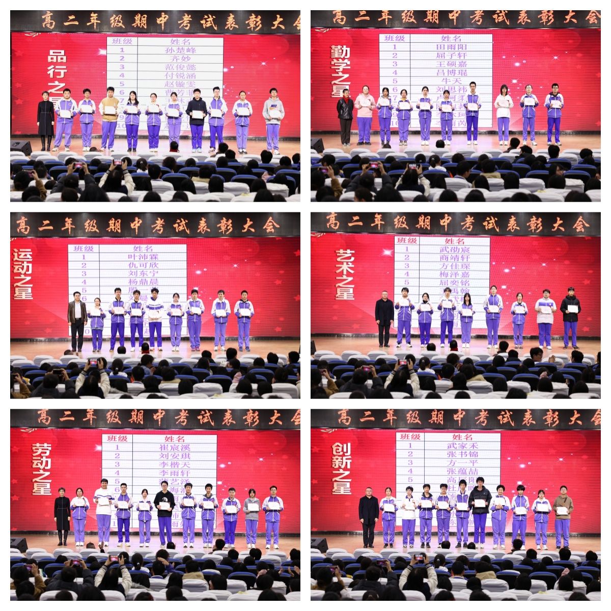 11月25日下午,大礼堂内灯光璀璨、气氛热烈,高二年级以 “五育并举群星灿,榜样引领启新程” 为主题的期中表彰大会隆重举行。大会主持人庄重宣读表彰名单,“学业卓越之星” 凭借扎实的学识脱颖而出,“学业进步之星” 以不懈的努力实现突破,“五育之星” 在品德修养、身心健康、审美素养、劳动实践中全面发展,另有一批在学科竞赛、体育竞技、艺术展演、志愿服务等领域取得优异成绩的同学荣登榜单。获奖学子依次登台领奖,鲜花映笑脸,掌声伴荣光,现场欢呼声此起彼伏,汇聚成致敬奋斗、崇尚优秀的青春旋律。