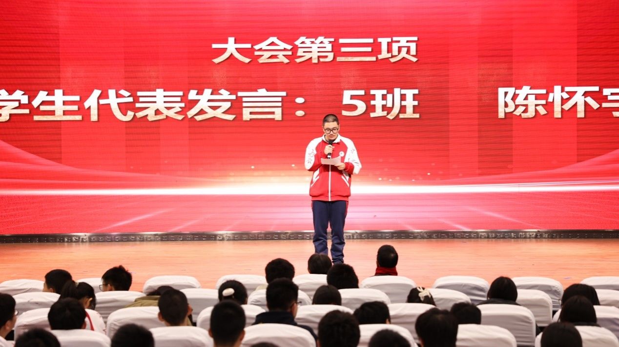 榜样的力量,在于照亮前路,更在于激励所有人同行,鼓励大家向榜样看齐,大会表彰之后由优秀学生代表高一5班陈怀宇发言,他结合自己学习与成长的心路历程,提到了目标、方法和坚持的重要性,也祝愿同学们都能坚定目标,找对方法,坚持努力,定会有所收获。