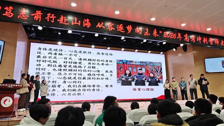 佟丽娟书记也为同学们加油鼓气。她深情回顾了民大附中从1913年蒙藏学校走来的百年红色基因,勉励同学们以书为梯、以志为帆,在最后的九十四天里沉心静气、厚积薄发。佟丽娟书记将个人奋斗与家国命运紧密相连,嘱托民附学子传承“美美与共”的校训精神,以青春之我赴强国之约,在更辽阔的天地间书写属于这一代人的华章。