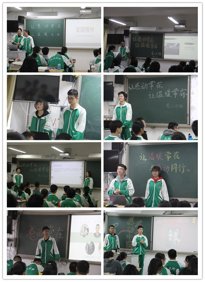 2019年3月4日下午,我校组织全校同学收看《2018年感动中国人物颁奖典礼》视频录像,并召开了“让感动常在,让温暖常存”主题班会,进行了一次关于真情、善良、无私、感恩的直观又深刻的思想教育。 班会主持人 班...