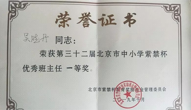 近日,在北京市教委组织的第32届“紫禁杯”优秀班主任表彰暨第7届北京市中小学“学生喜爱的班主任”评选总结展示交流活动中,我校吴晓丹老师荣获“紫禁杯”优秀班主任一等奖。 北京市中小学“紫禁杯”优秀班主任...