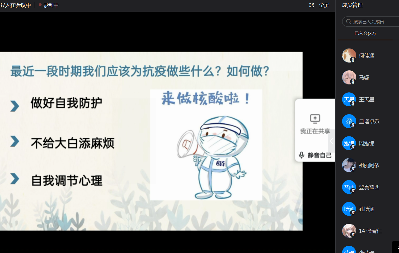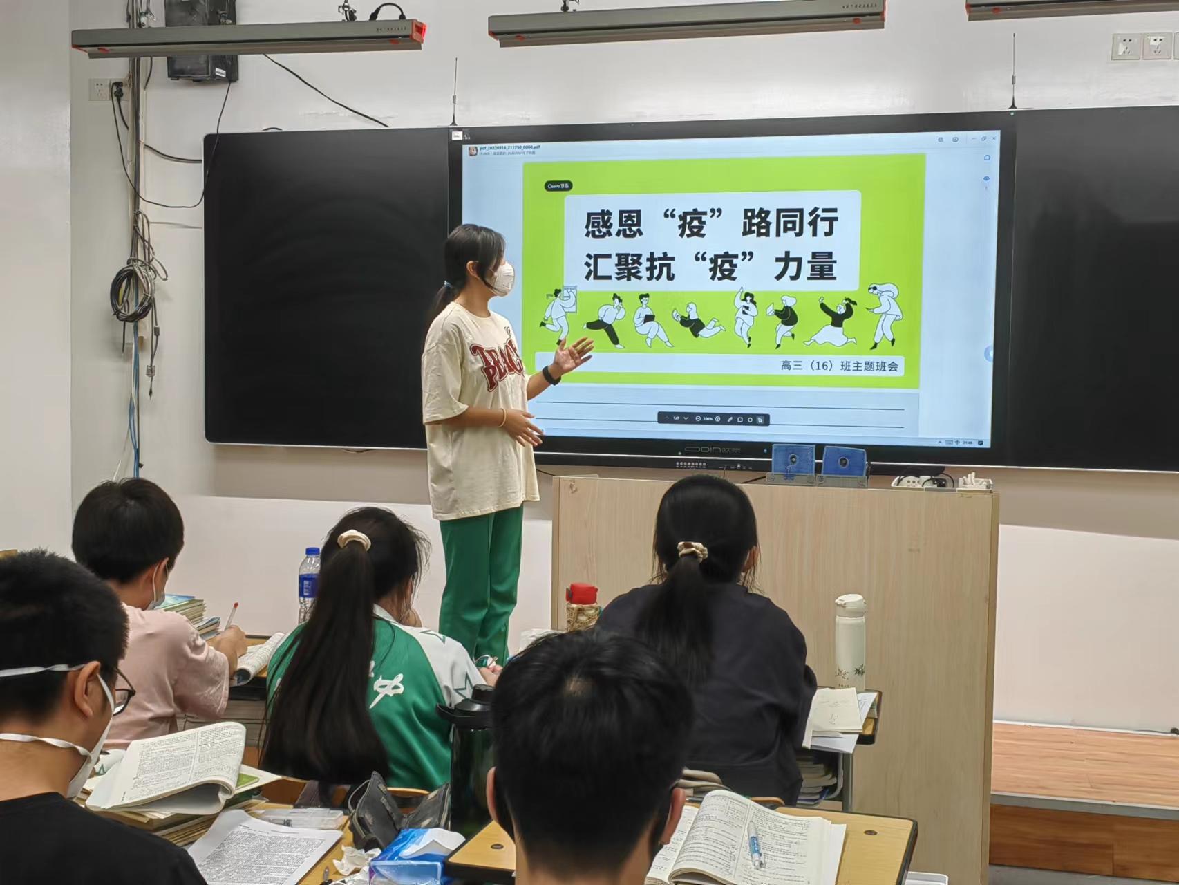 疫情防控是人生成长的大课堂,防疫抗疫是思想政治的教科书。 为深入学习贯彻习近平总书记关于“大思政课”建设的重要指示精神,有效落实学校党委关于疫情防控工作的部署要求,9月12日晚,我校各班开展了“同心抗疫,...