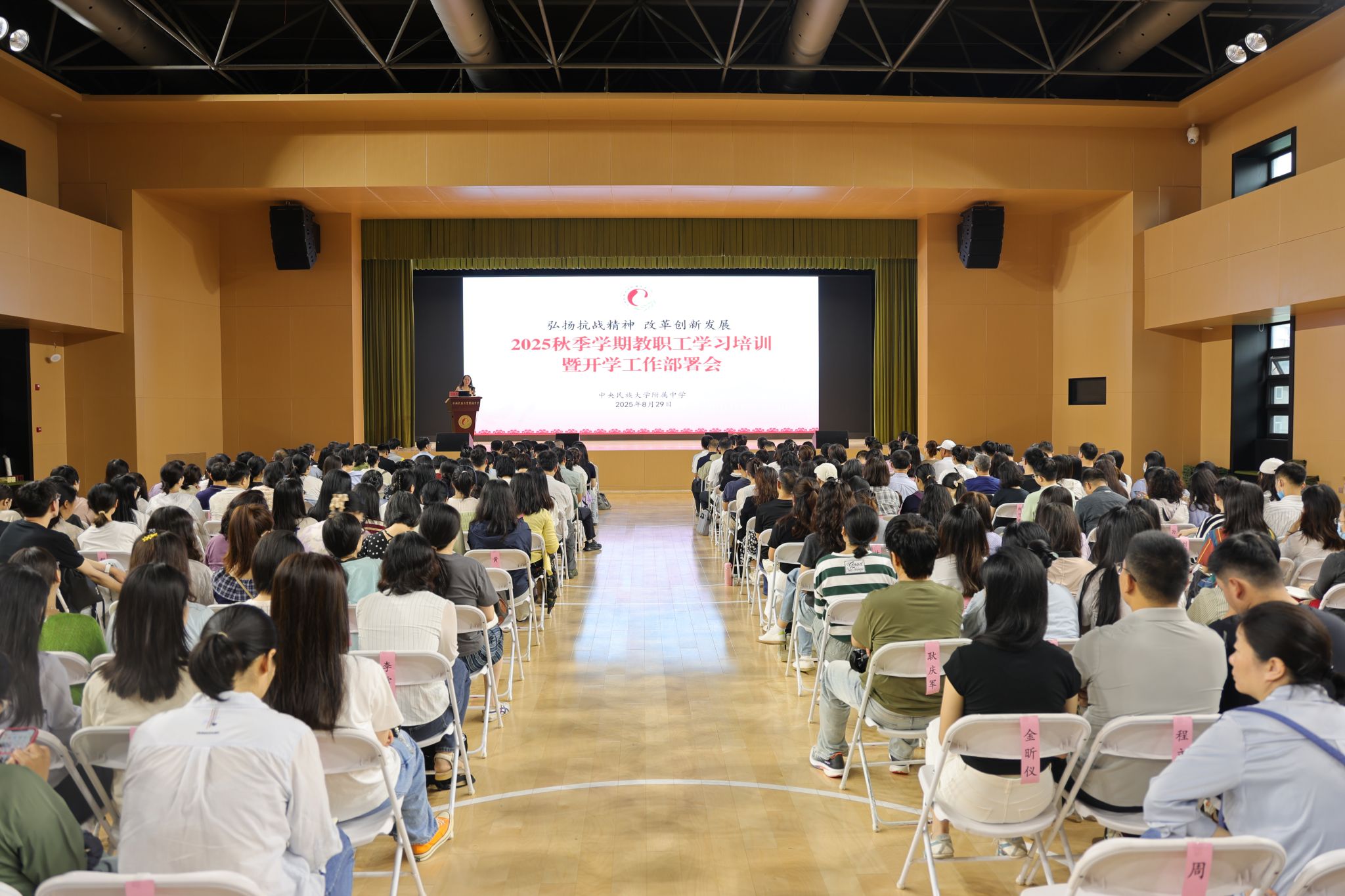 2025年8月29日,我校在海淀校区召开秋季学期教职工学习培训暨开学工作部署会。会议以铸牢中华民族共同体意识为主线,围绕“弘扬抗战精神 改革创新发展”的主题,全面部署新学期重点工作。会议由党委常务副书记佟丽娟主持。海淀朝阳两校区初、高中全体教职工参会。学习培训党委常务副书记佟丽娟以“新时代新民附 传承抗战精神 汲取前行力量”为主题进行政治思想引领。习近平总书记指出,伟大抗战精神是中国人民弥足珍贵的精神财...